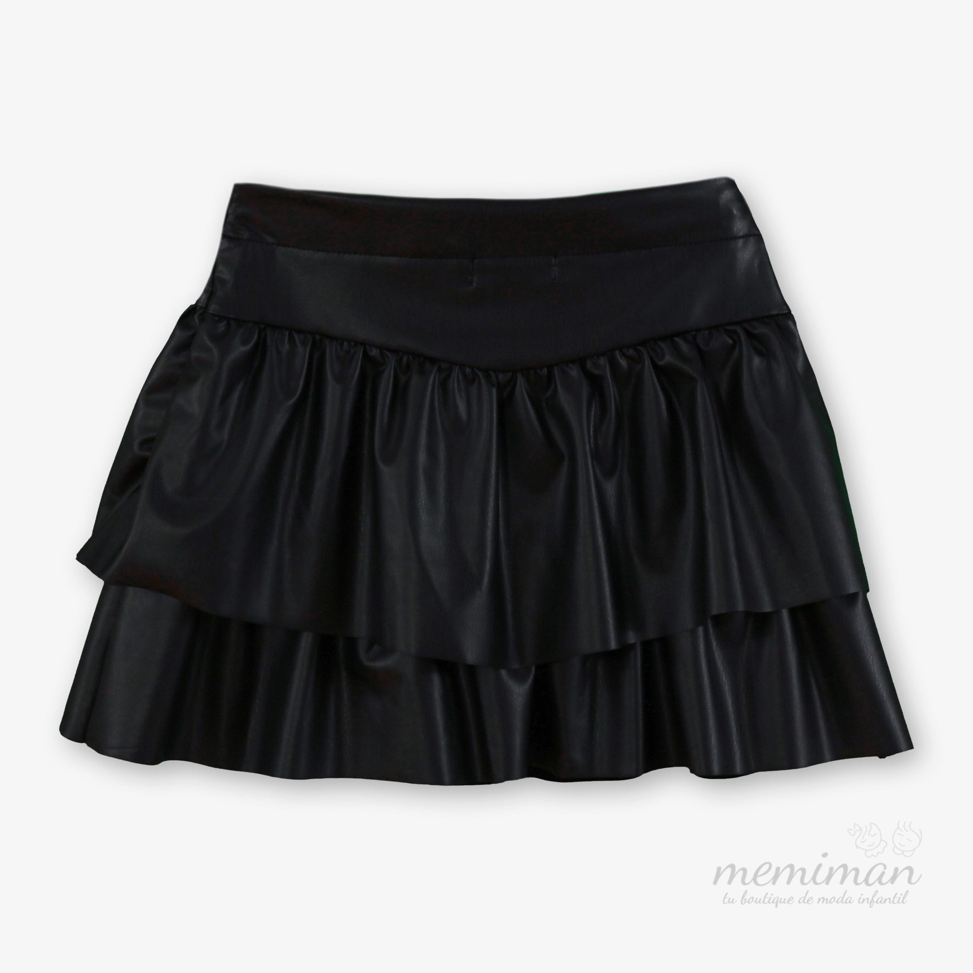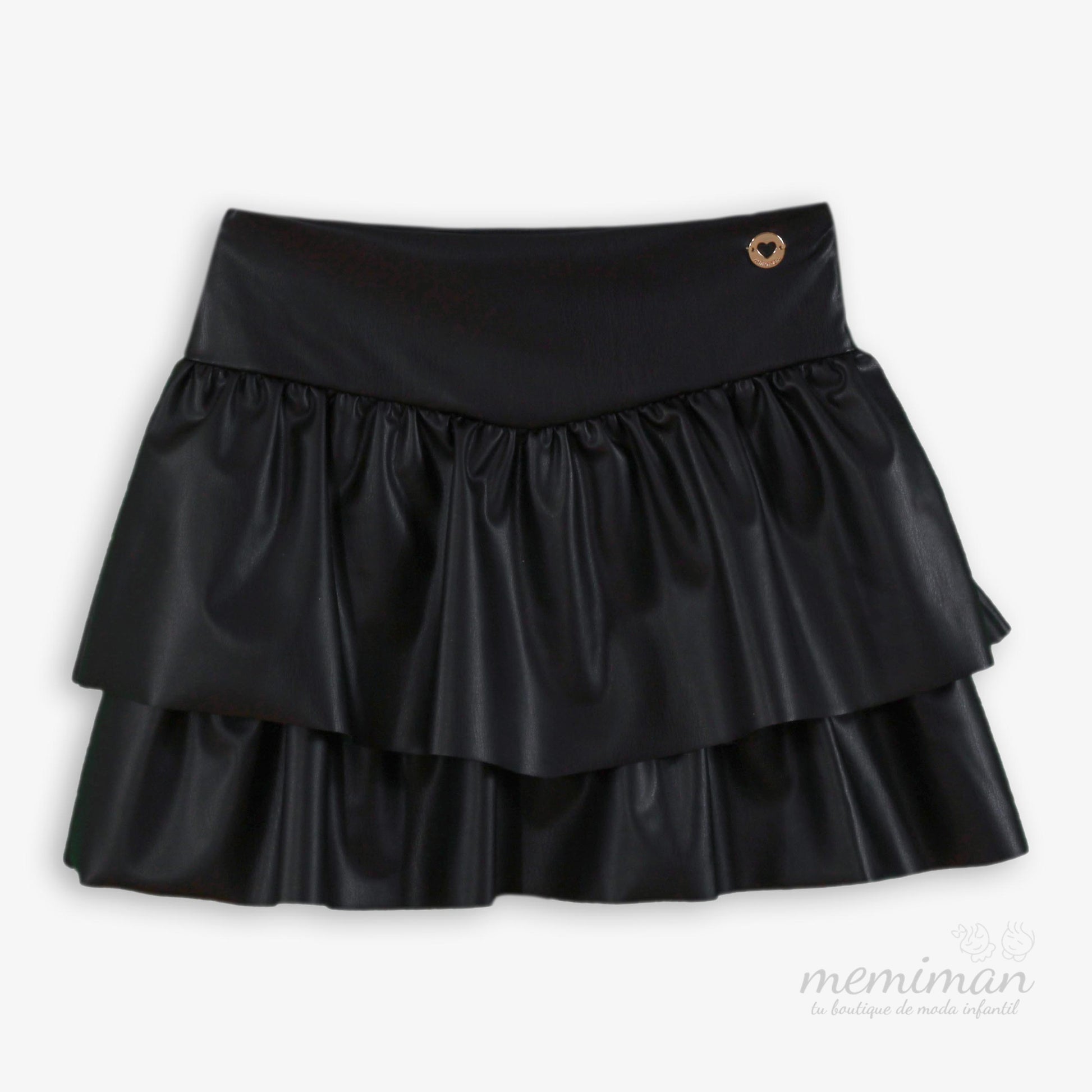 This girls' short skirt features a double ruffle design in faux leather fabric, adding texture and movement. Its cut provides a comfortable and modern fit, ideal for sophisticated and versatile looks. Perfect for special occasions or to add an elegant touch to any child's outfit.