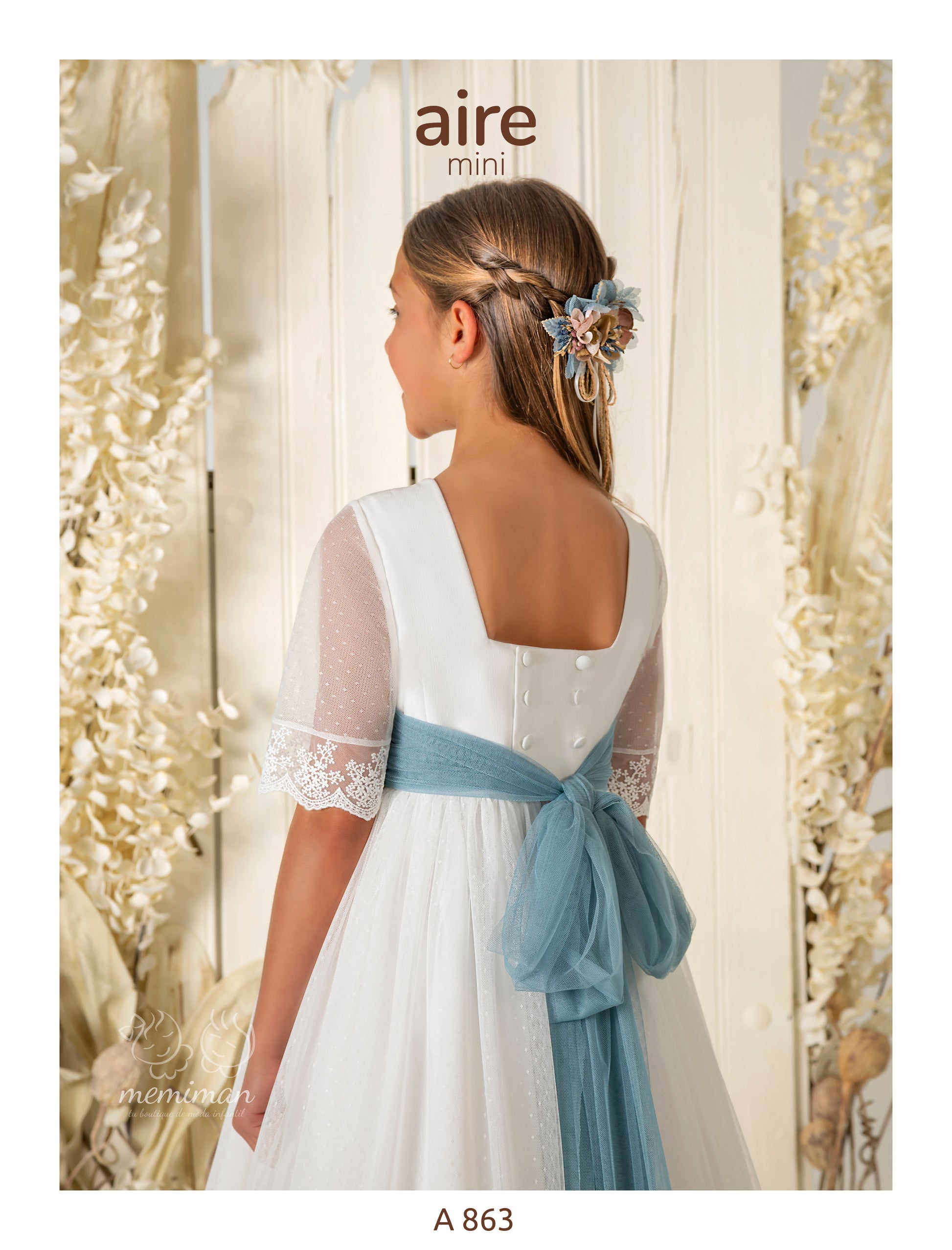 Handcrafted headpiece designed especially for First Communion dresses. Made with delicate fabric flowers and stamens that create an elegant and sophisticated finish. Each piece is handmade, guaranteeing quality and attention to detail. Perfect for completing a girl's look on her special day, adding a touch of distinction and beauty to her ensemble. A unique accessory that enhances any First Communion dress.