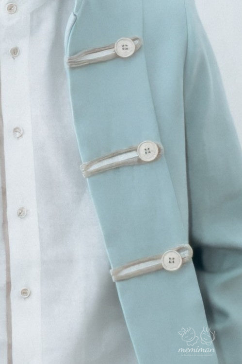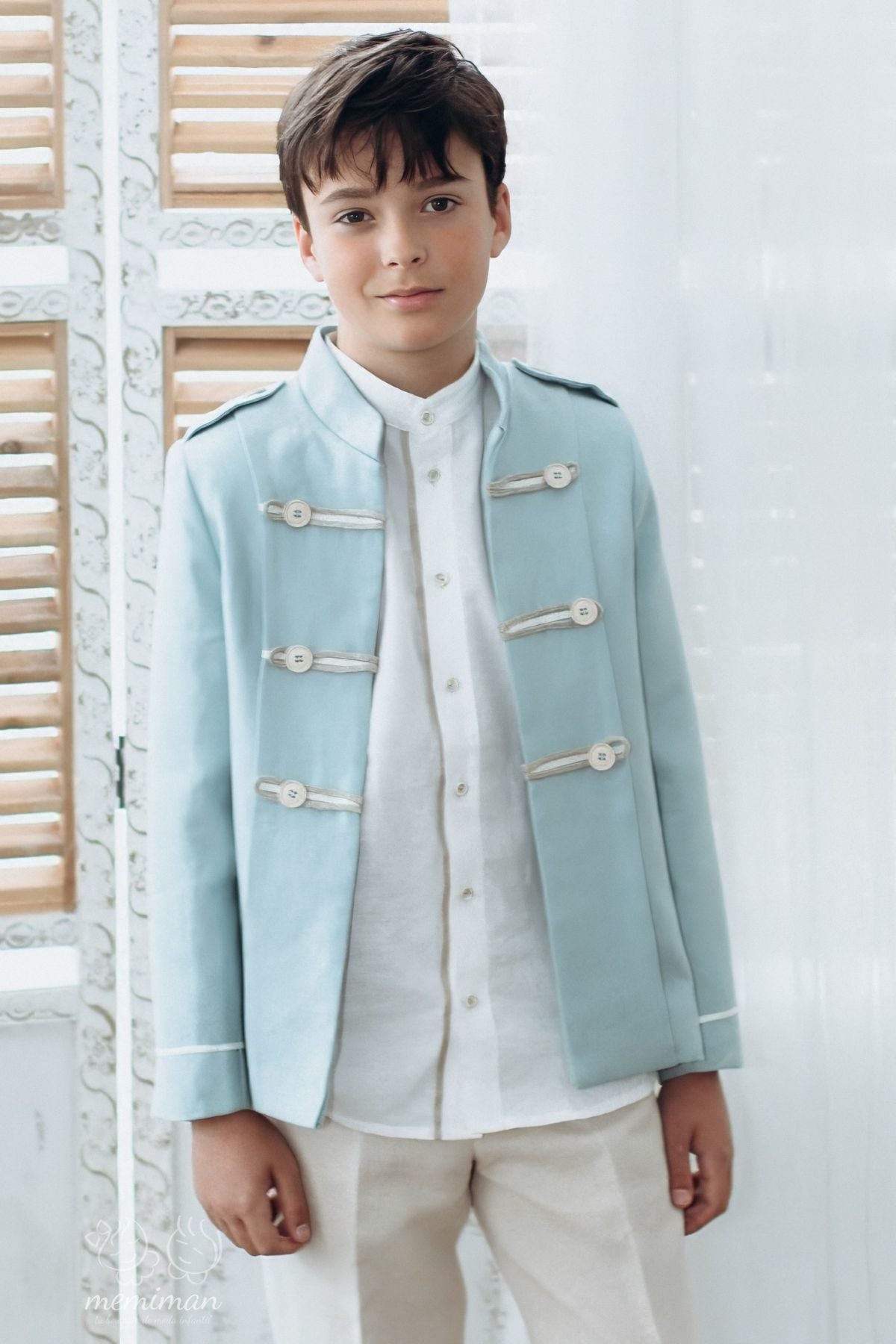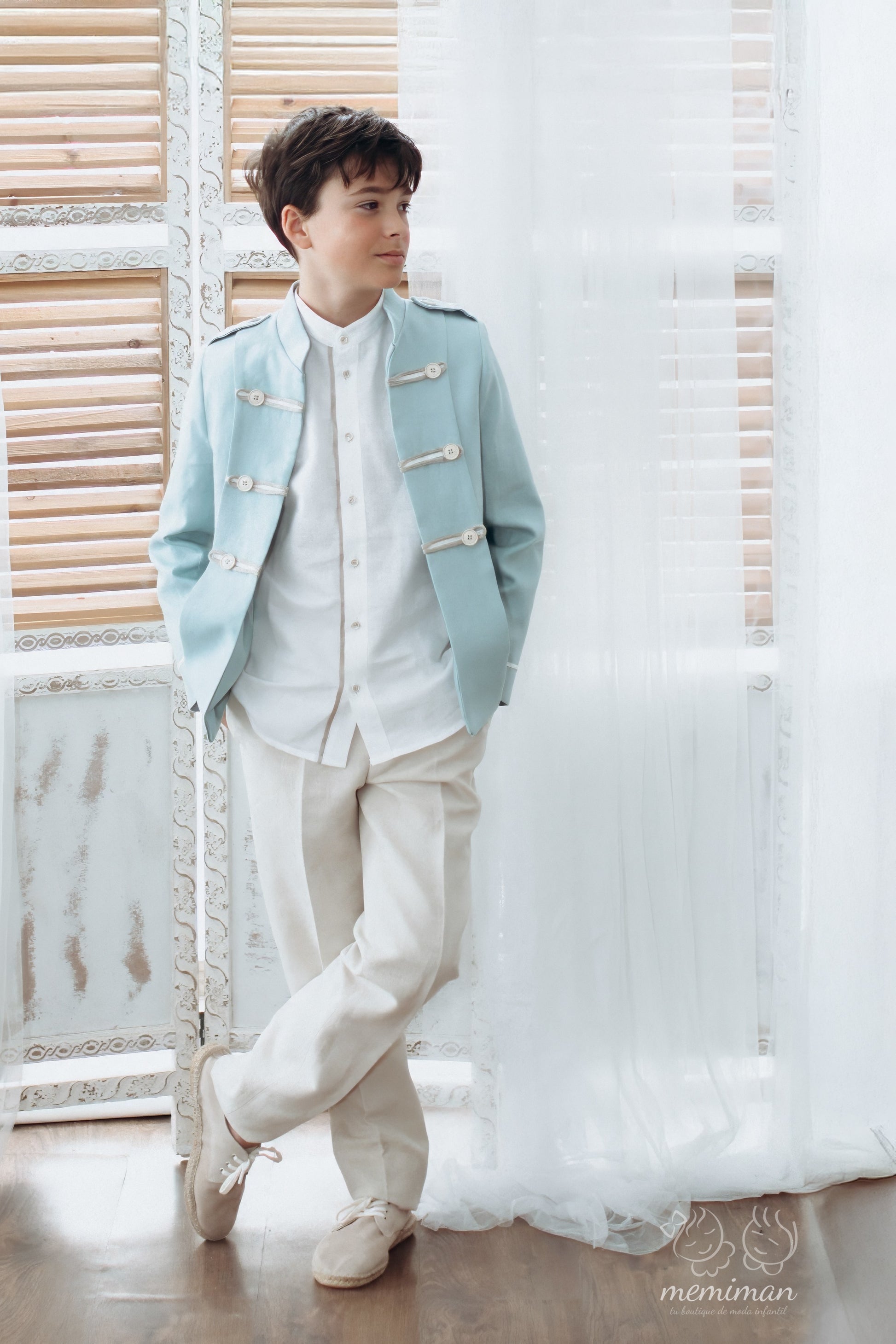 This admiral suit, crafted in sage green linen with earthy details, combines a modern and casual design, perfect for the day of the communion. Its straight-cut jacket with natural buttons provides freshness and youthful elegance, while the straight-cut trousers, available in long or Bermuda shorts, guarantee comfort and freedom of movement. The matching shirt completes this outfit, designed to make boys feel special and secure on such a significant occasion.