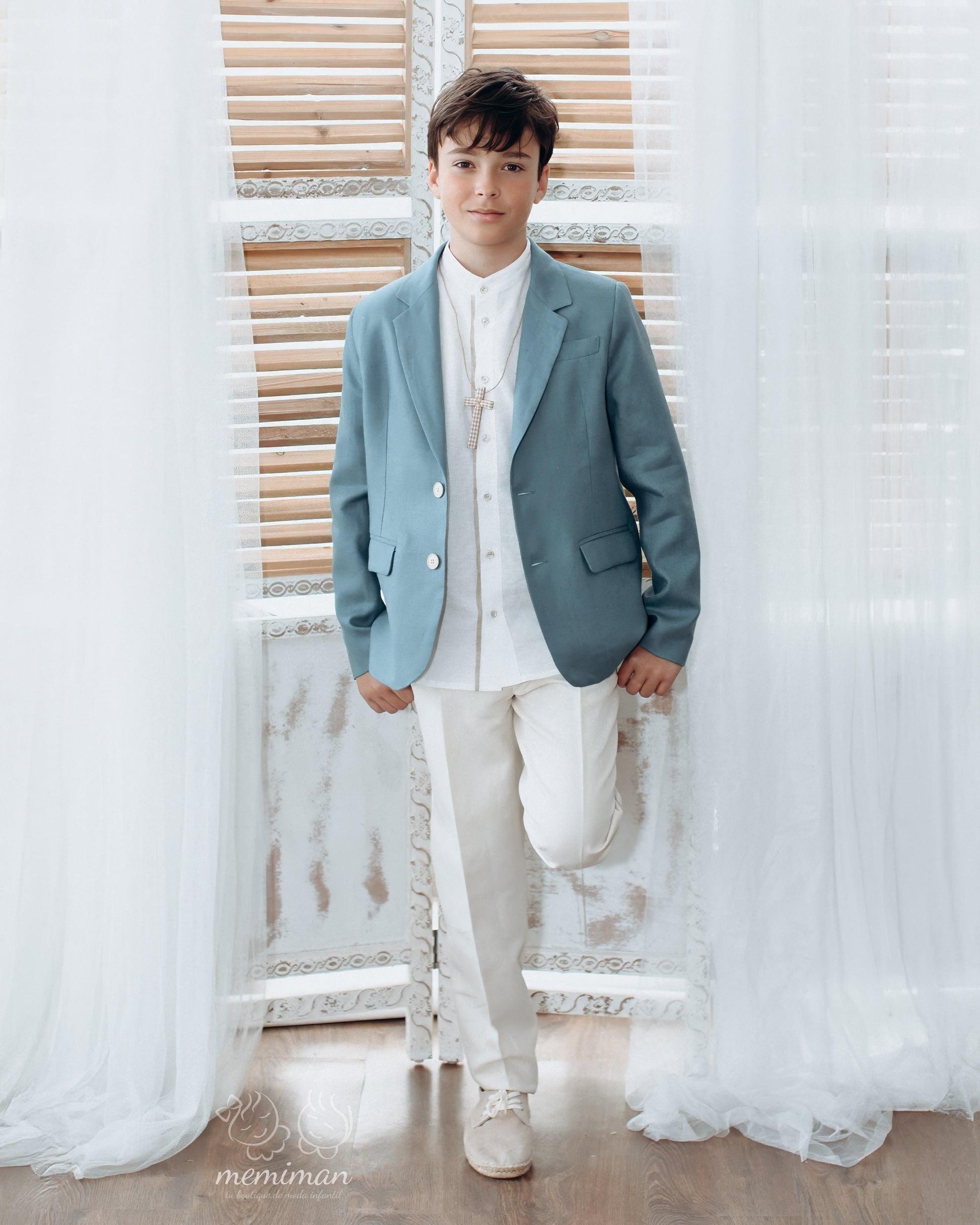 The set stands out for its clean lines, impeccable cut, and versatility. Perfect for boys who want to look elegant with a modern touch, it pairs perfectly with accessories such as crosses, sashes, or linen and leather shoes.