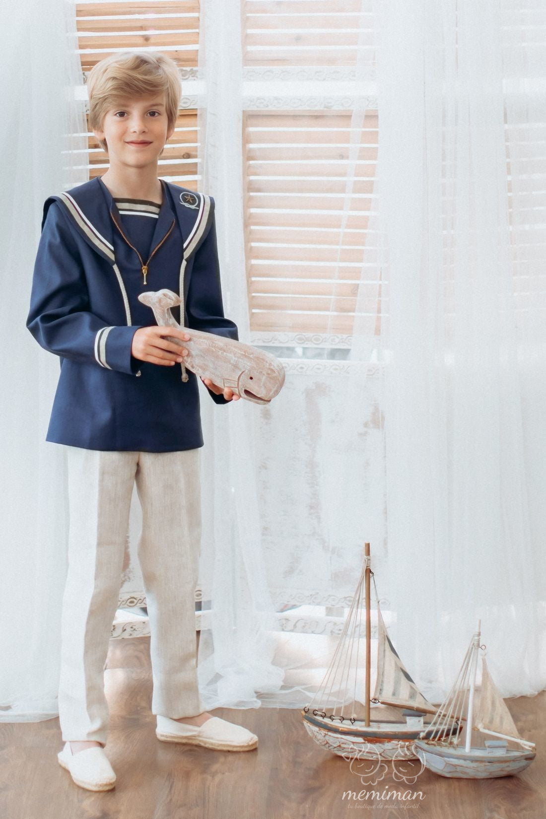 This sailor suit combines elegance and comfort with a navy and earth-tone linen design. The jacket stands out with its metal front zipper for a modern and casual look, while the trousers, available in long or Bermuda shorts, are lined to prevent transparency. The cape completes the look with jute and cotton details in ivory, and a sailor knot badge with a metallic star adds a distinctive touch. A perfect choice for a communion with style and comfort.