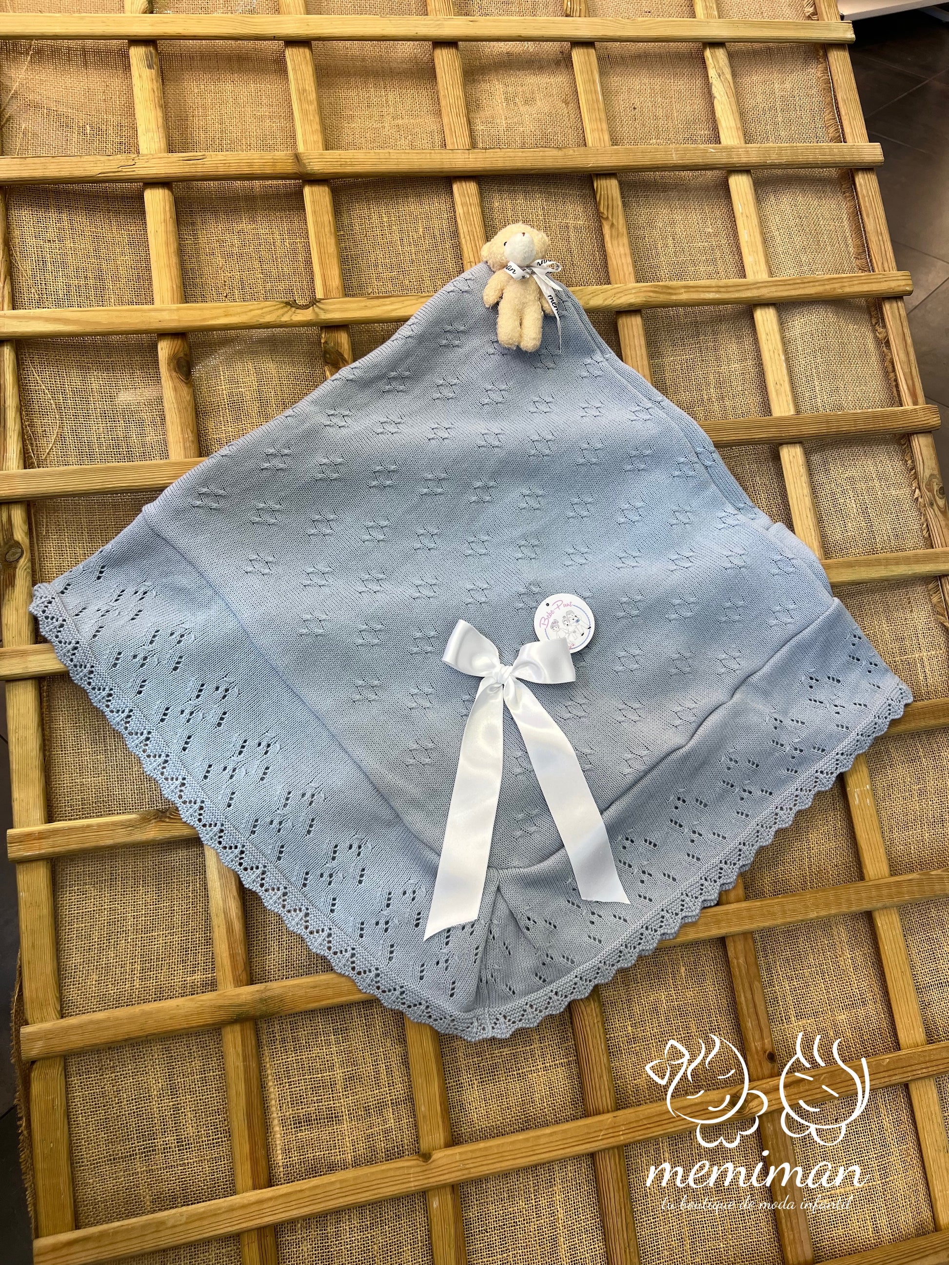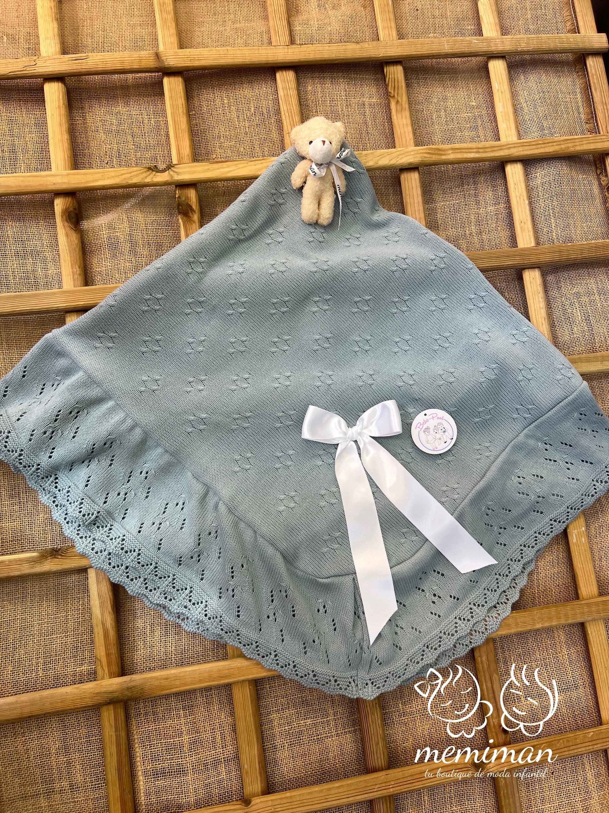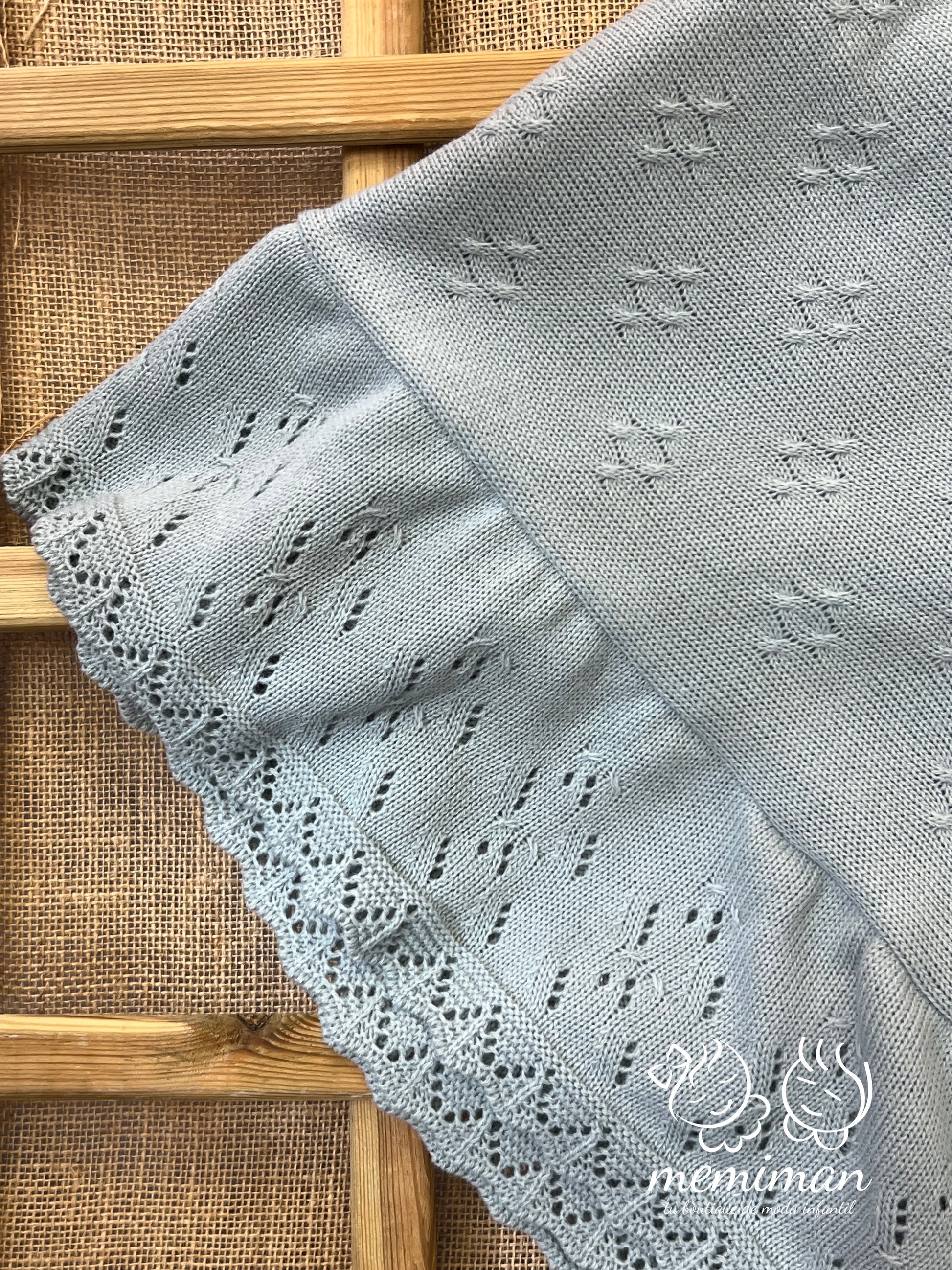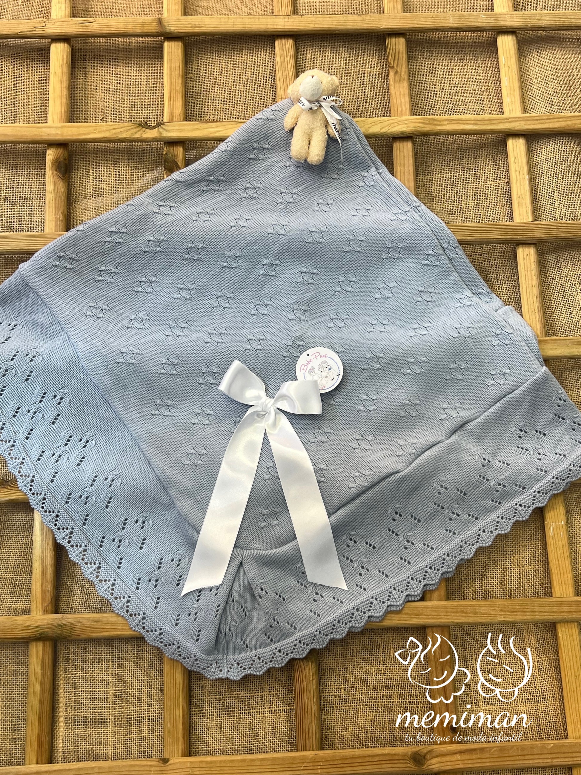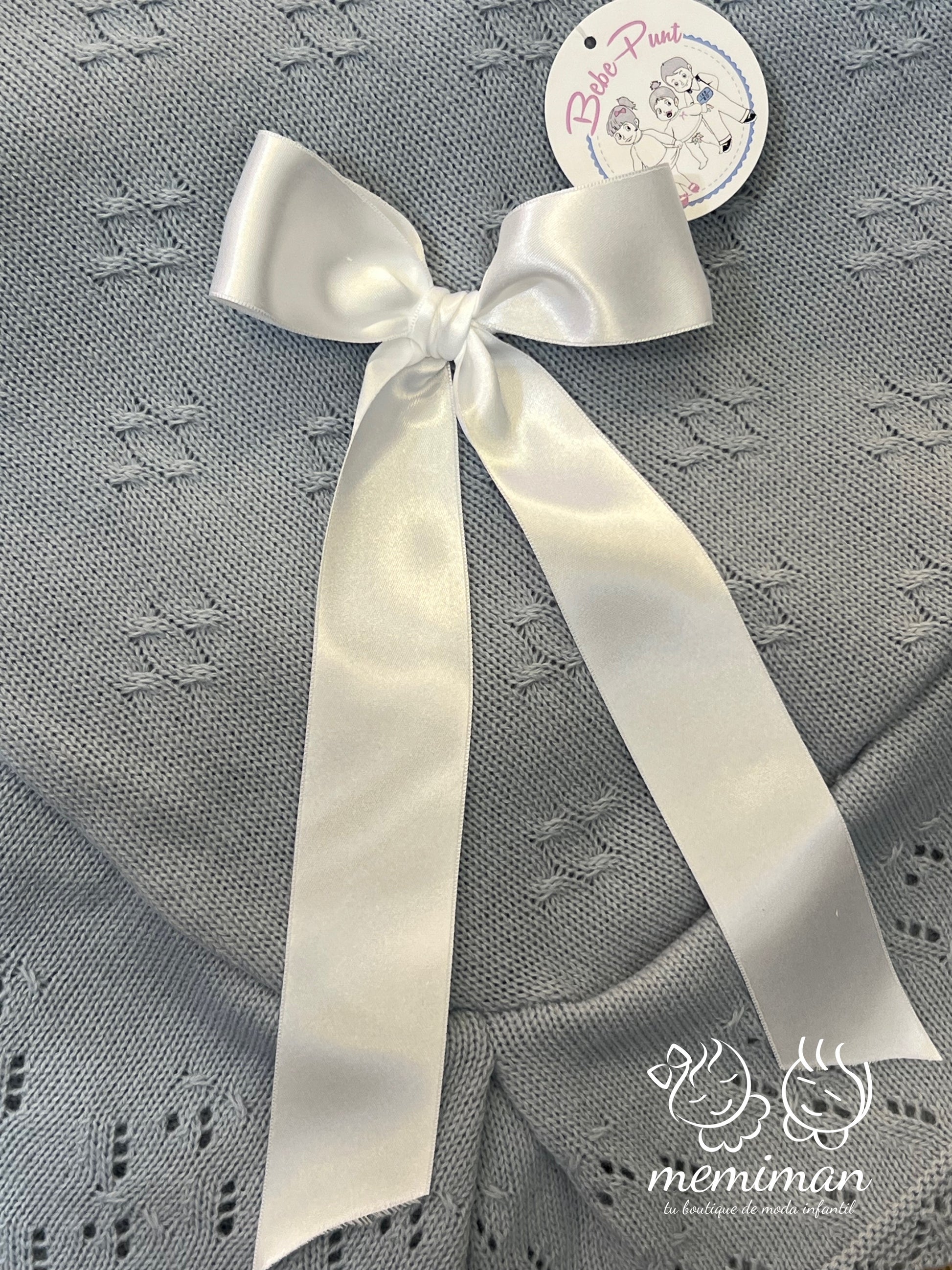 Ce châle arbore un tricot élaboré, orné de pompons ajourés à chevrons et d'une délicate bordure en dentelle, apportant texture et élégance. Son grand nœud en satin lui confère une finition raffinée, idéale pour accessoiriser vos tenues lors d'occasions formelles ou spéciales, avec une touche artisanale raffinée.