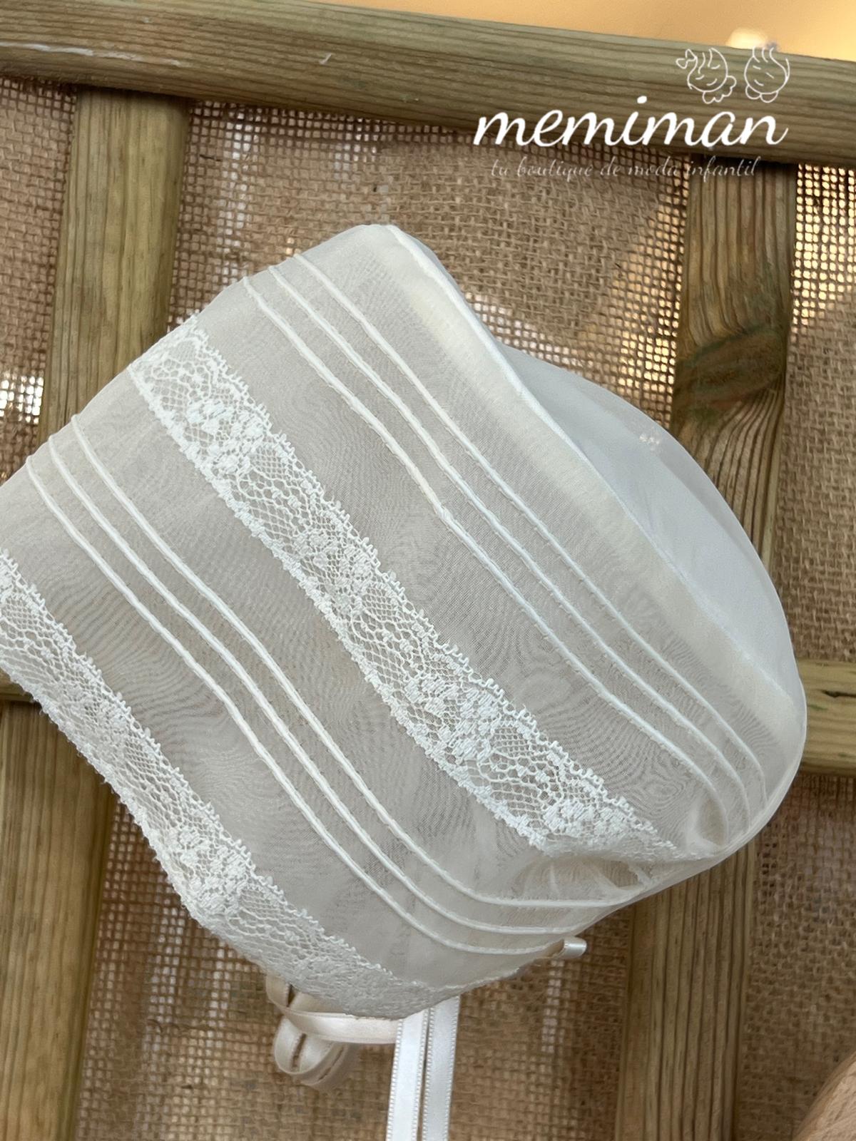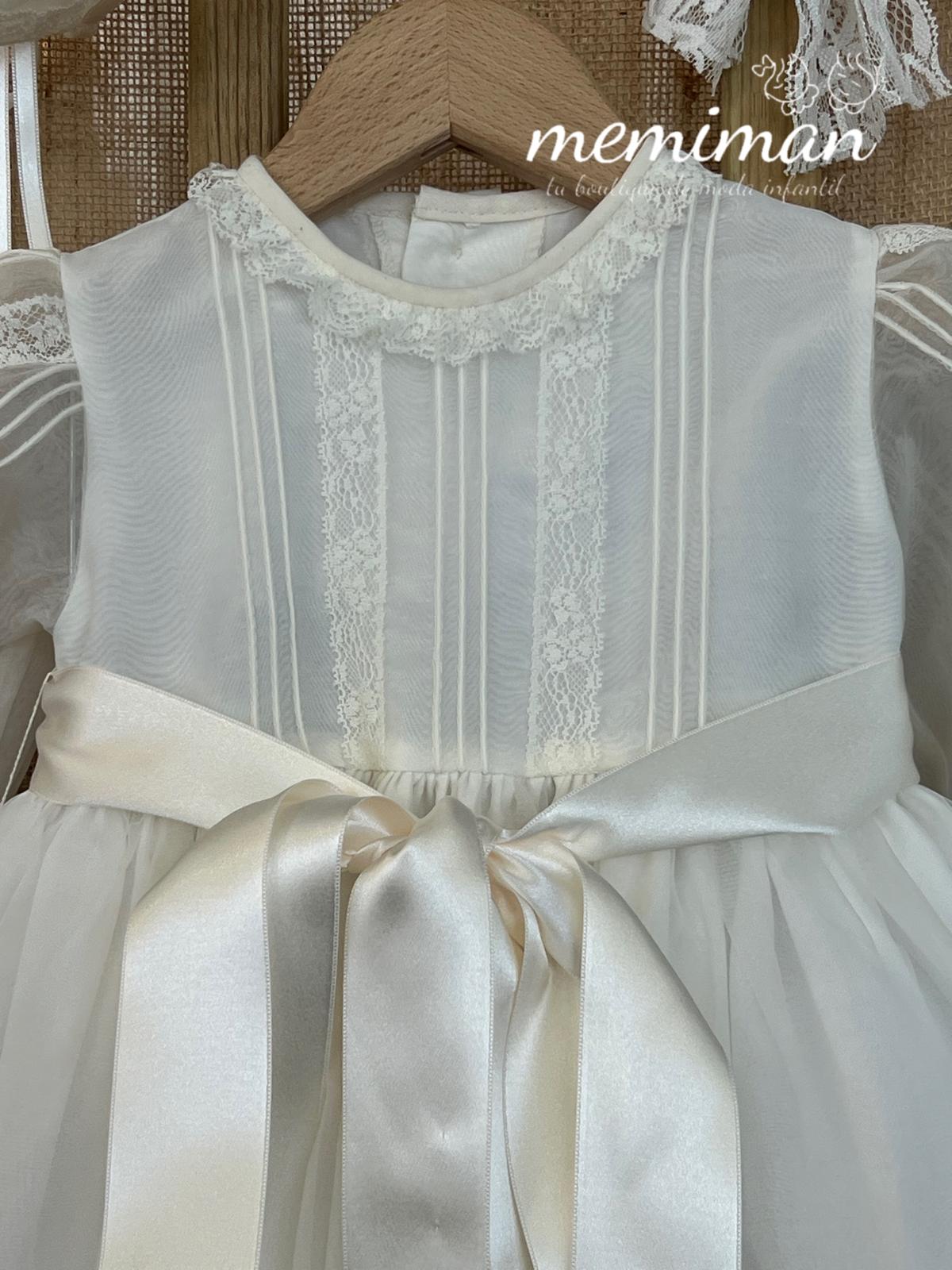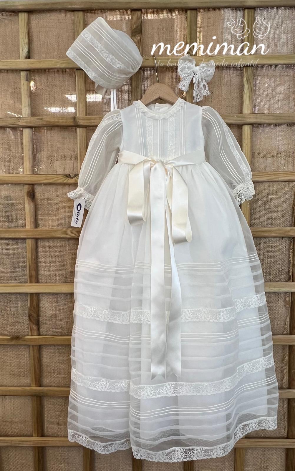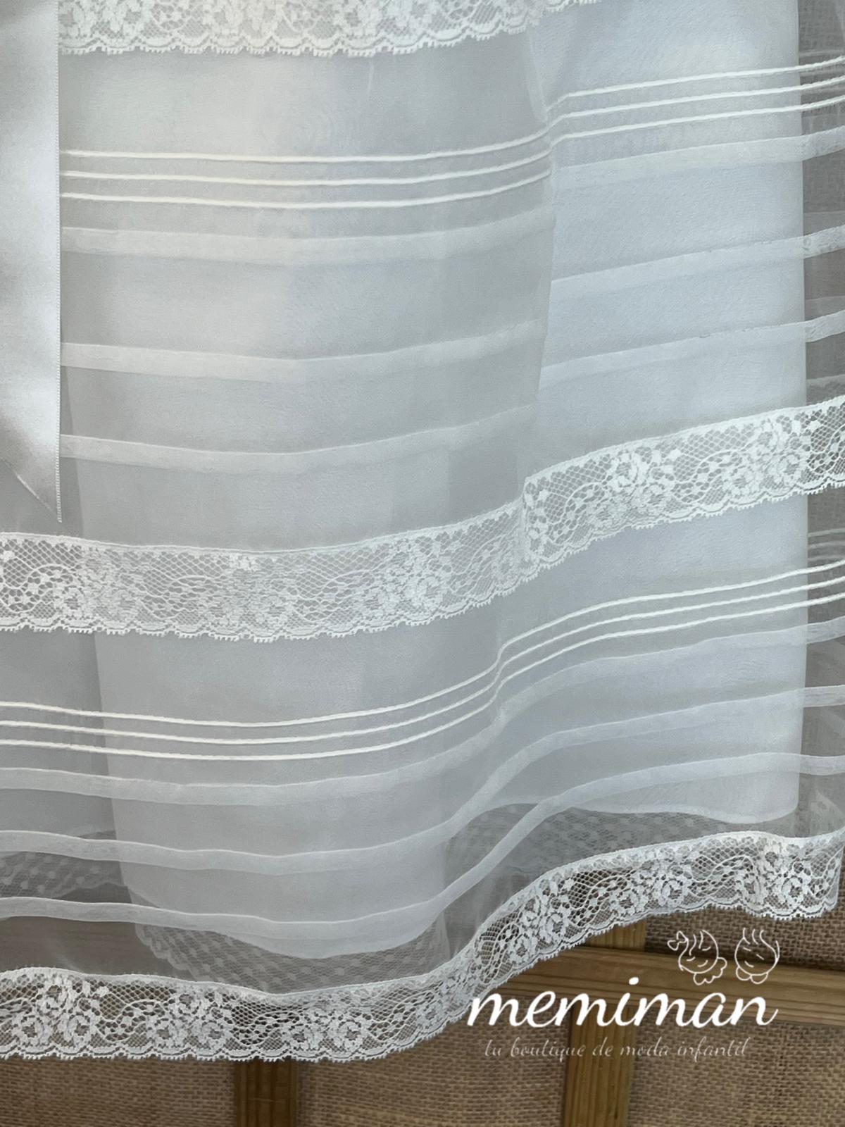 Este faldón largo para bautizo está elaborado en delicada gasa de cristal bordada con bodoques, realzado con puntillas finas, jaretas cuidadosamente trabajadas y un lazo elegante. Incluye una capota a juego, completando un conjunto clásico y sofisticado ideal para ceremonias especiales. Su confección experta garantiza comodidad y un acabado impecable para ese día tan importante.