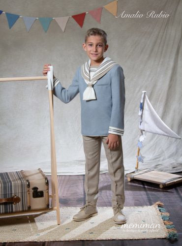 Traje marinero bicolor o al tono para comunión. Pantalón pitillo con dos bolsillos en color azul claro o natural. Casaca color azul claro con remates en arena y crudo. Se puede fabricar en otro color. (Carta de colores bajo demanda). De la colección comunión 2023 de Amalio Rubio.