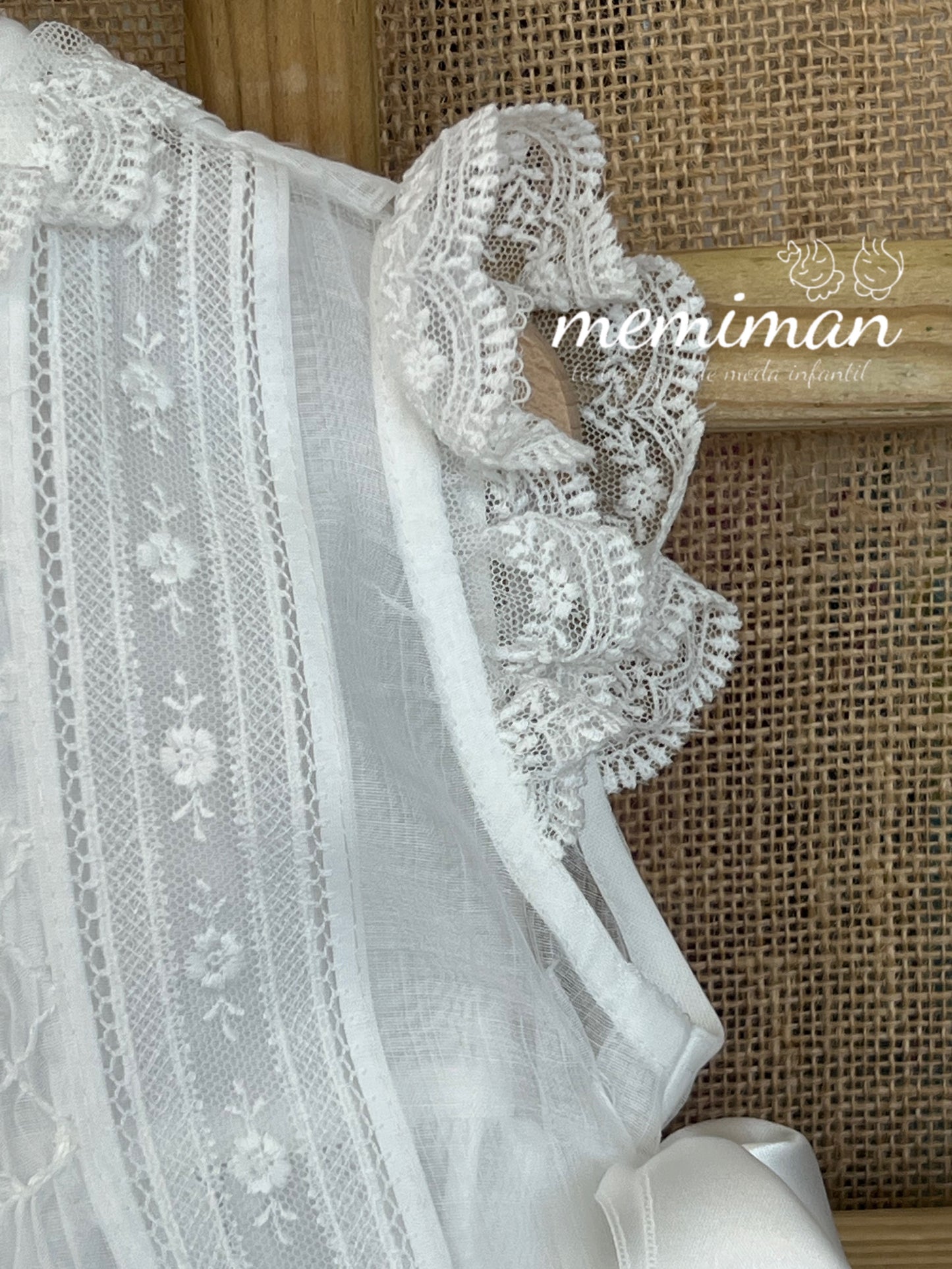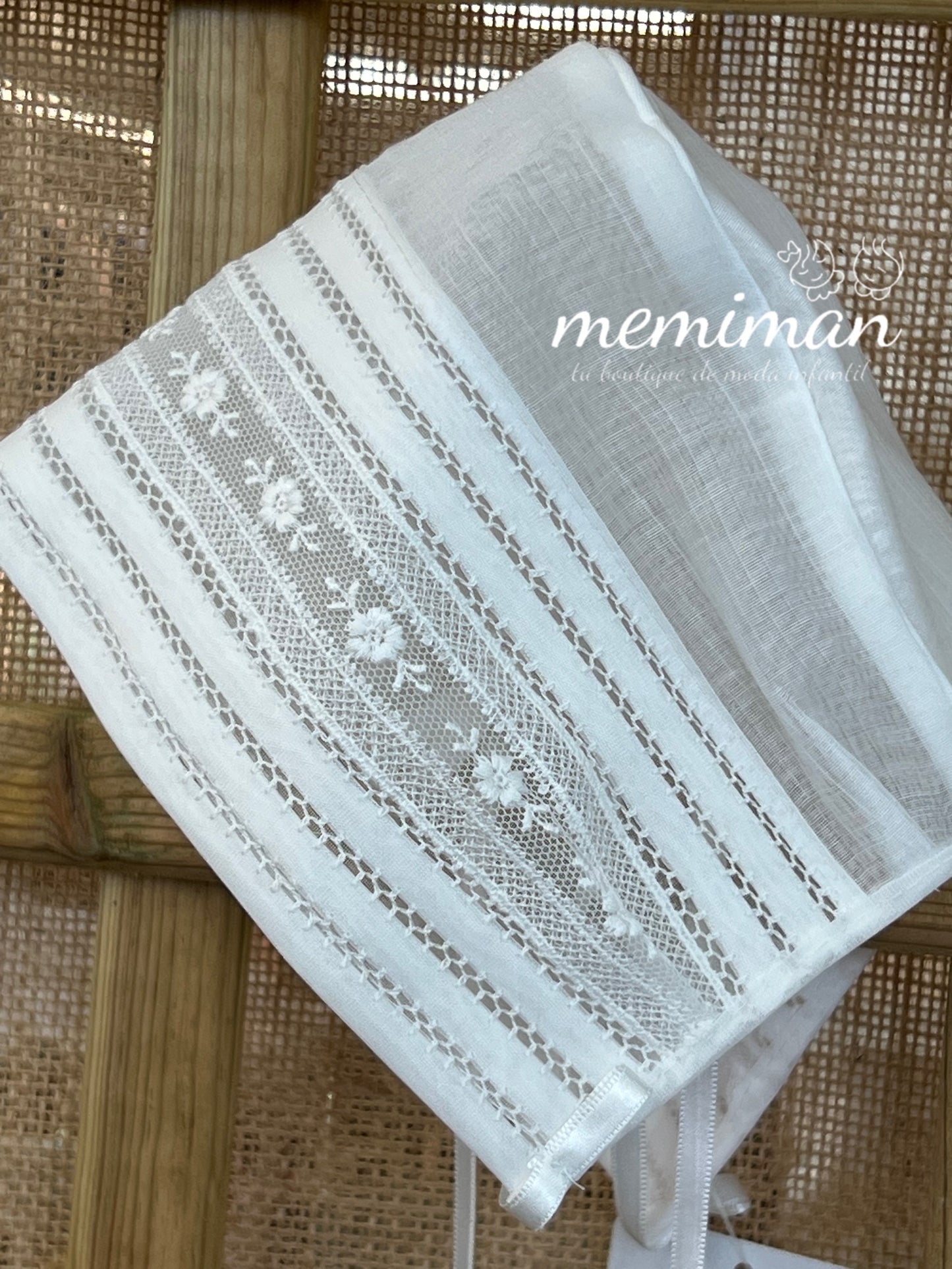 Esta mantilla, confeccionada de forma artesanal en delicada batista inglesa de color blanco roto, destaca por su encaje fino, bordado a mano y un lazo de raso a juego. Incluye capota a juego, ofreciendo una presentación elegante y tradicional para ocasiones especiales, garantizando comodidad y un acabado impecable. Ideal para ceremonias que requieren un toque clásico y sofisticado. Su composición de 67% poliéster y 33% algodón garantiza comodidad y durabilidad. Para mantener su calidad, se recomienda lavado en ciclo delicado, evitar blanqueadores y secadora, y planchar a baja temperatura. Ideal para ocasiones especiales que requieren un toque clásico y refinado.