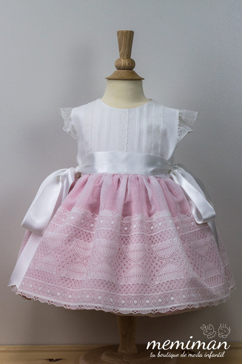 Este vestido para ocasión especial está confeccionado en batista inglesa de color blanco roto, aportando un acabado delicado y elegante. Detallado con encaje y un lazo a juego, combina tradición y sofisticación, ideal para eventos que requieren un toque refinado y exclusivo. Su diseño cuidado garantiza comodidad y estilo en momentos únicos.