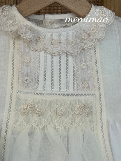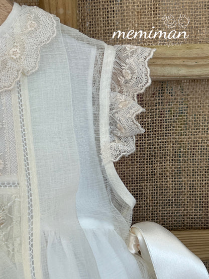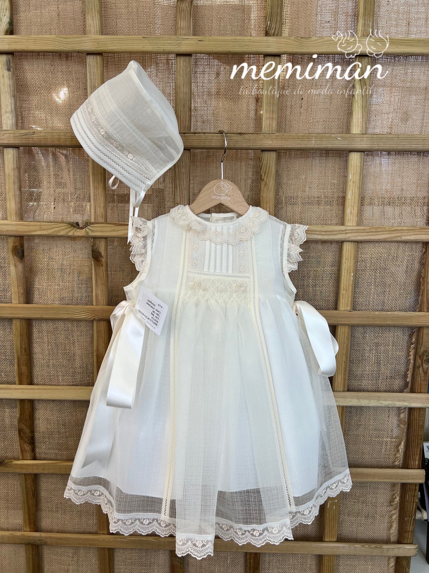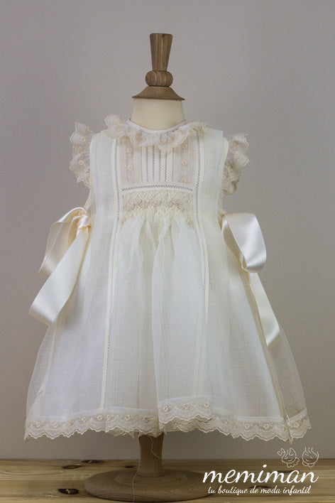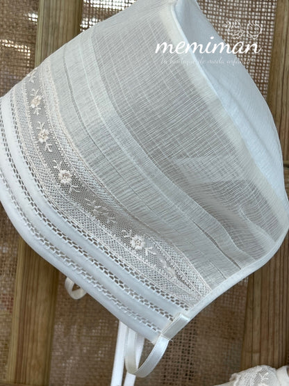 Esta mantilla y capota están confeccionados de forma artesanal en batista inglesa rústica de color beige, combinando elegancia y textura natural. Detallada con encaje, frunce y un lazo de raso a juego, ofrece un acabado delicado y sofisticado. Su composición de 67% poliéster y 33% algodón garantiza comodidad y durabilidad. Para mantener su calidad, se recomienda lavado en ciclo delicado, evitar blanqueadores y secadora, y planchar a baja temperatura. Ideal para ocasiones especiales que requieren un toque clásico y refinado. De la colección Bautizo de Creaciones Charo.