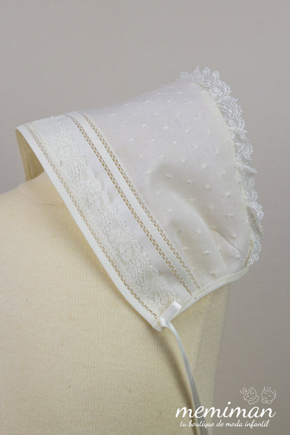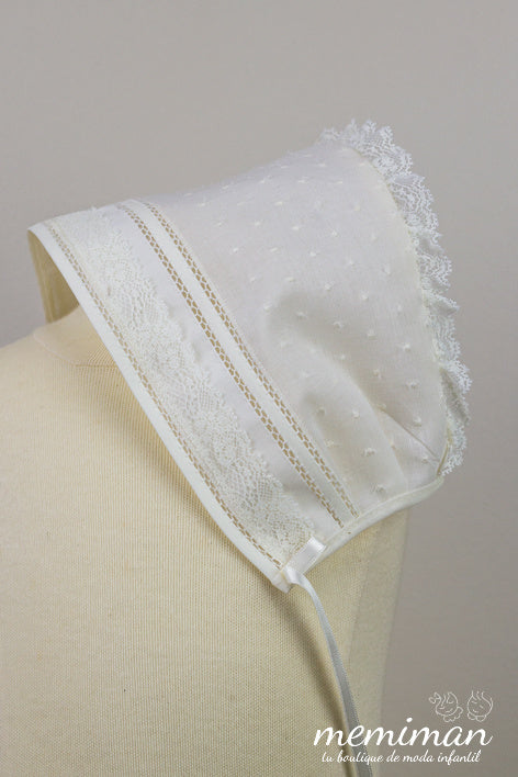 Gorro fabricado en plumeti batista color beis con el encaje y cinta de raso del mismo color.