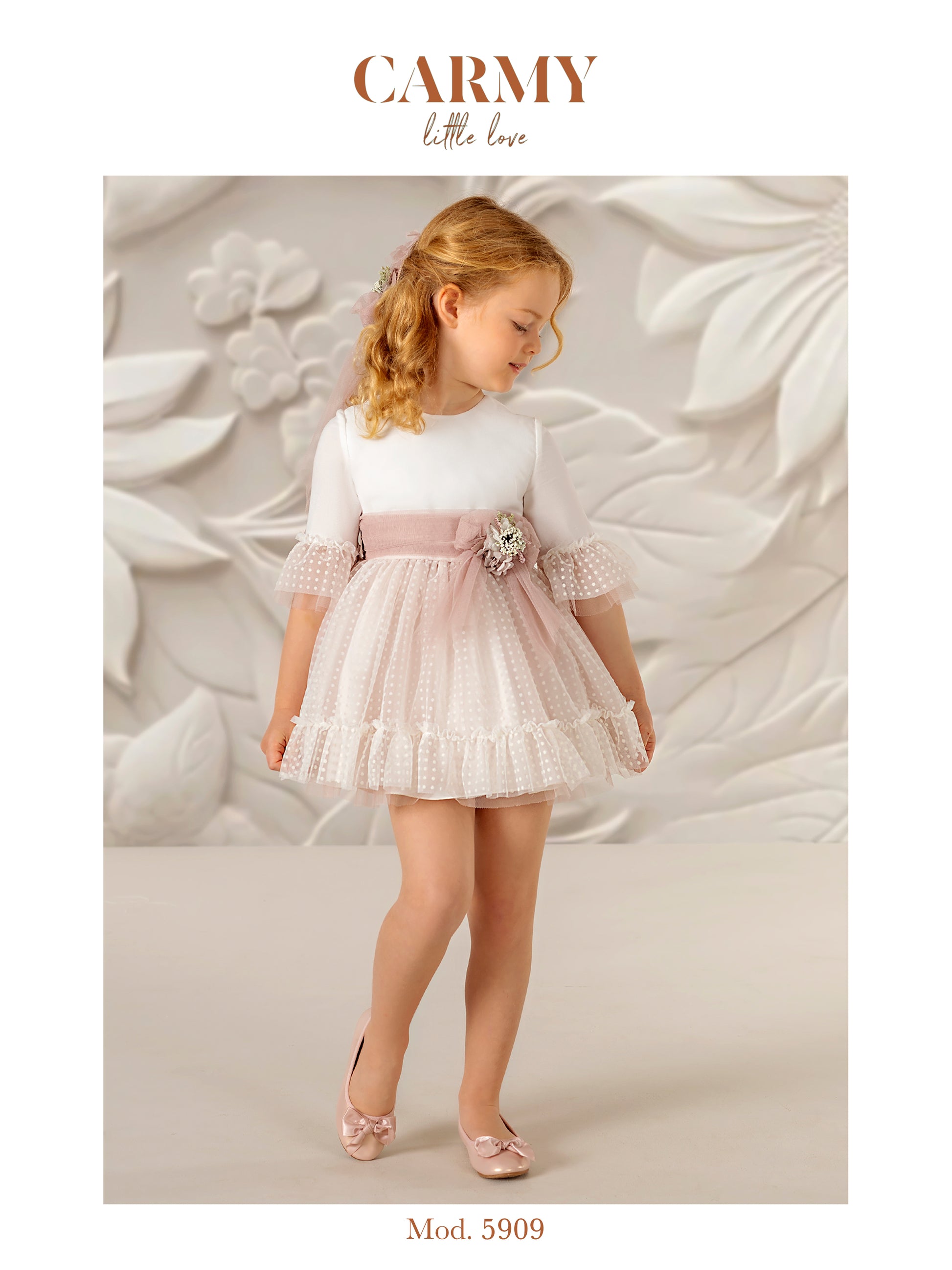 Este elegante vestido de ceremonia está confeccionado en tul flocado y tul maquillaje, creando una combinación sofisticada. Sus mangas de largo al codo, adornadas con delicados volantes, añaden un toque romántico. Un cinturón en tul maquillaje acentúa la cintura, coronado con un pequeño lazo decorado con flores, aportando un aire fresco y encantador. Ideal para ocasiones especiales..