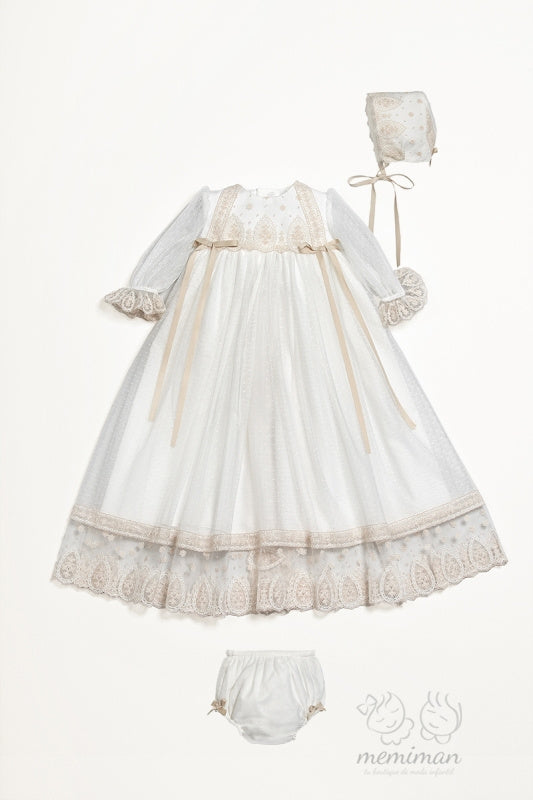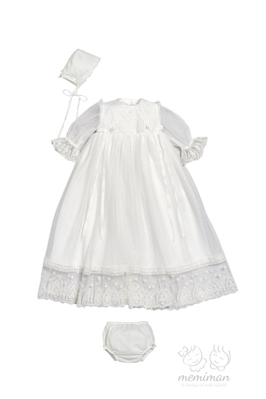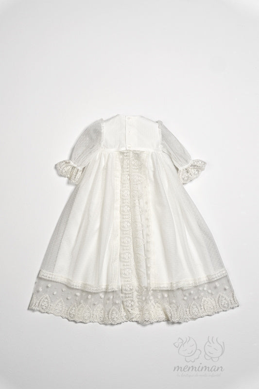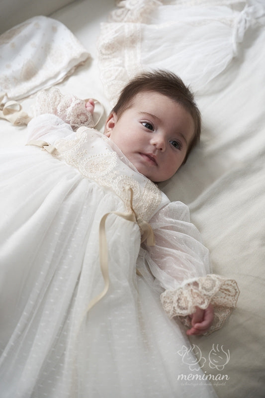 Precioso faldón de bautizo de manga larga confeccionado en tul con topos que combina elegancia y comodidad para tu bebé. Incluye capota a juego y cubrepañal decorado con delicado encaje de Valencié, detalles que le dan un toque sofisticado y especial. Perfecto para ocasiones importantes este conjunto ofrece la calidad y el cuidado que merece tu pequeño.