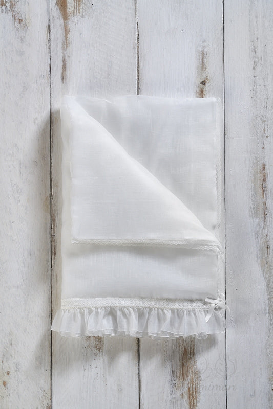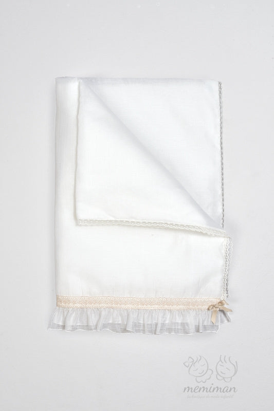 Manta de entretiempo perfecta para envolver a tu bebé en momentos especiales. Diseñada con elegancia, cuenta con dos volantes laterales que añaden un toque romántico y un bonito entredos con detalles tostados que realzan su belleza. Su relleno fino y moldeable, combinado con un forro exterior suave, proporciona la máxima comodidad y calidez. Una prenda versátil que acompaña a tu pequeño en cada ocasión importante, brindando tanto estilo como funcionalidad.