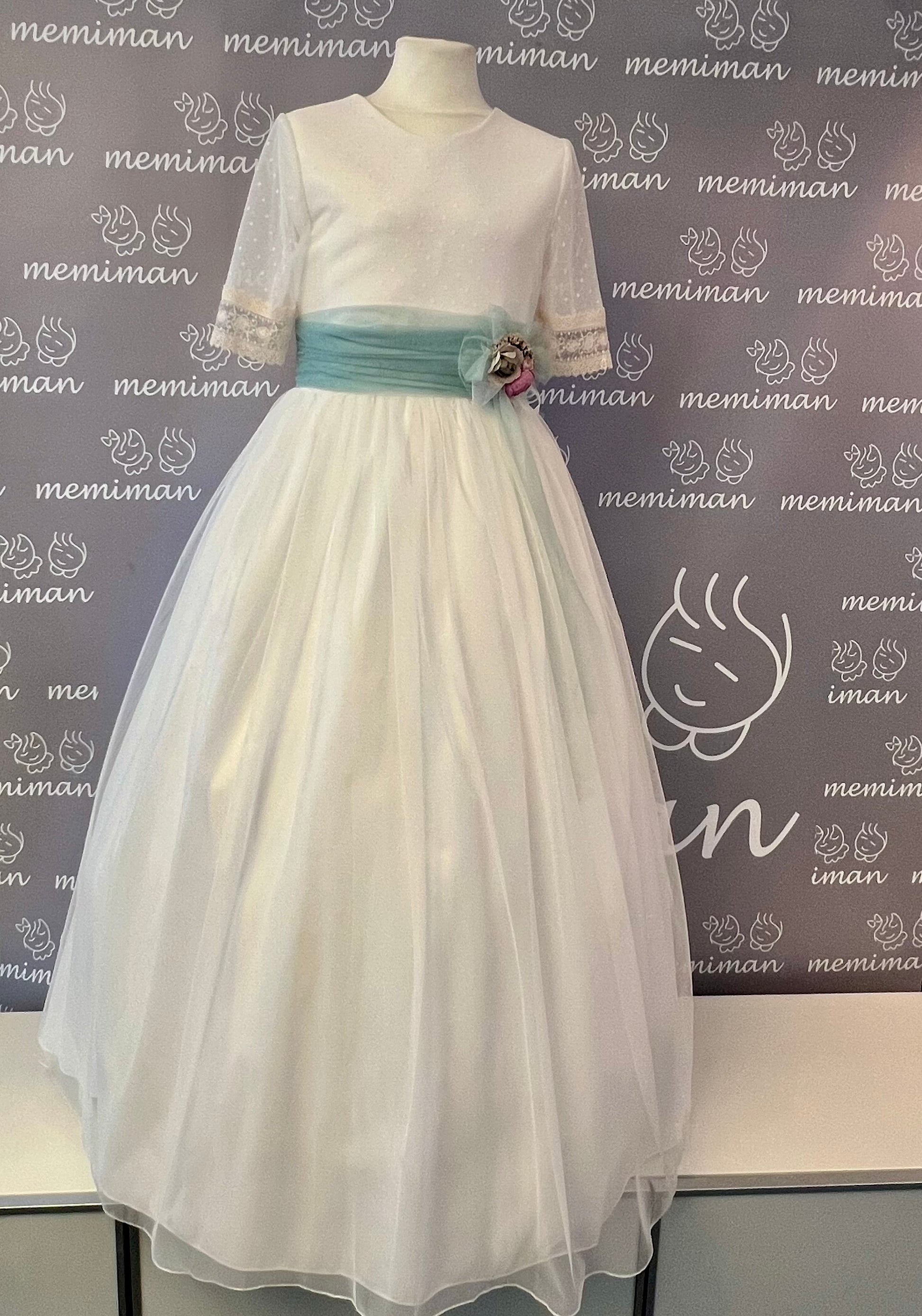 Vestido de comunión confeccionado en tul de color natural con fajín verde agua, diseñado para resaltar la elegancia en momentos especiales.