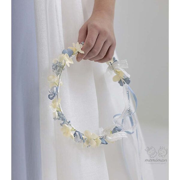 Corona artesanal diseñada especialmente para vestidos de comunión. Elaborada con delicadas flores de tela y pistilos que crean un acabado elegante y sofisticado. Cada pieza es confeccionada a mano, garantizando calidad y atención al detalle. Perfecta para completar el look de la niña en su día especial, añadiendo un toque de distinción y belleza a su conjunto. Un accesorio único que realza cualquier vestido de comunión.
