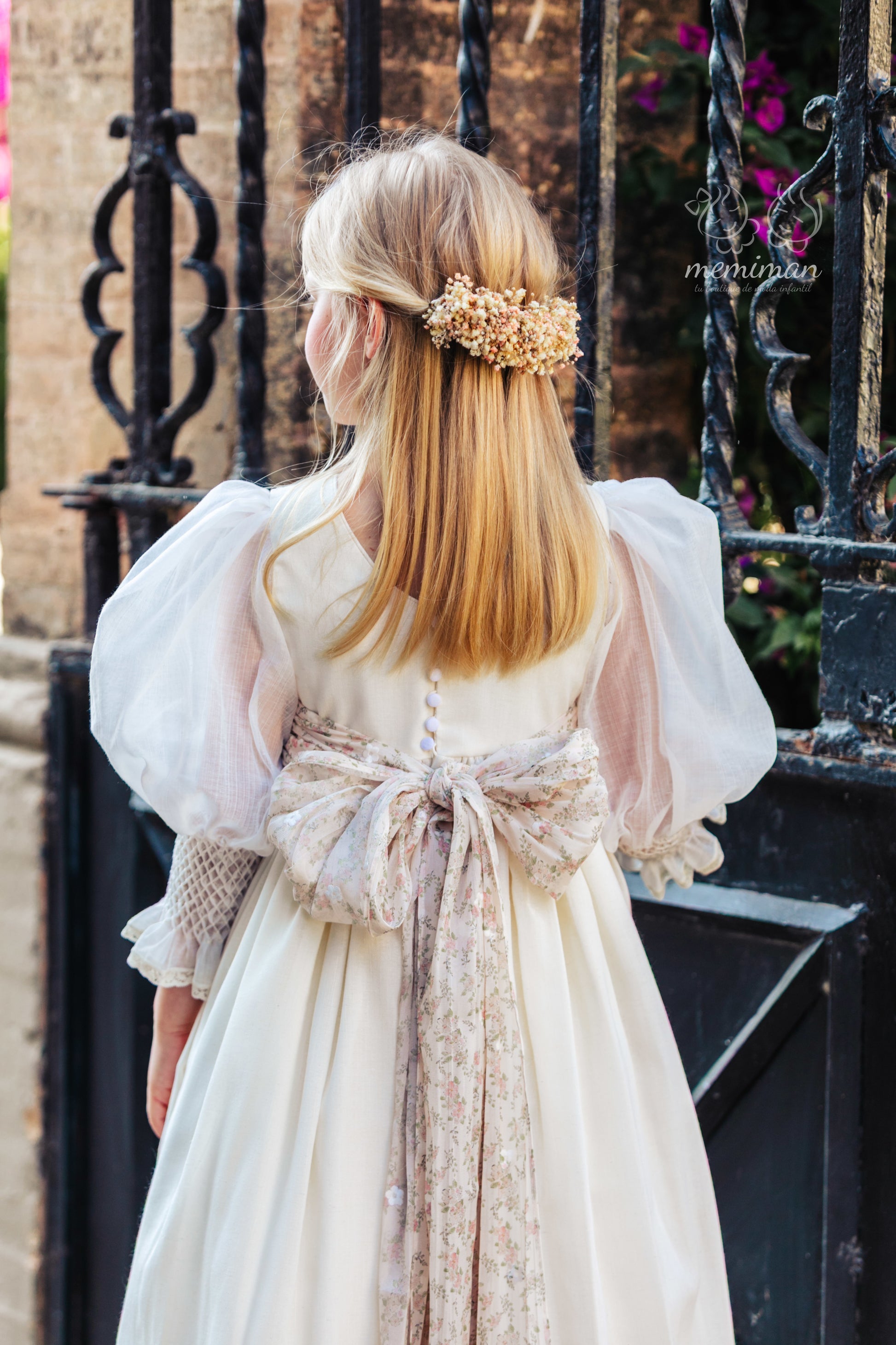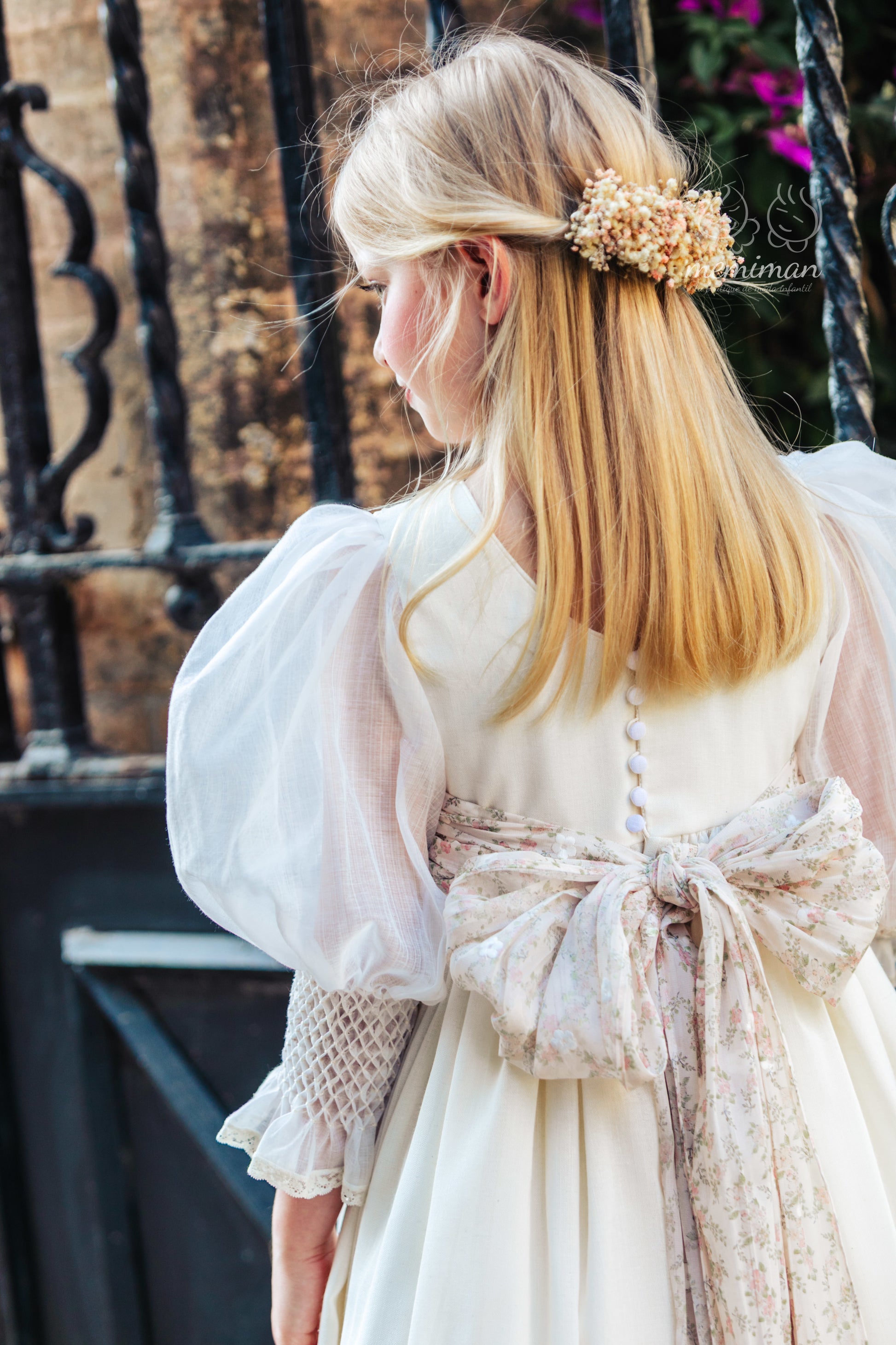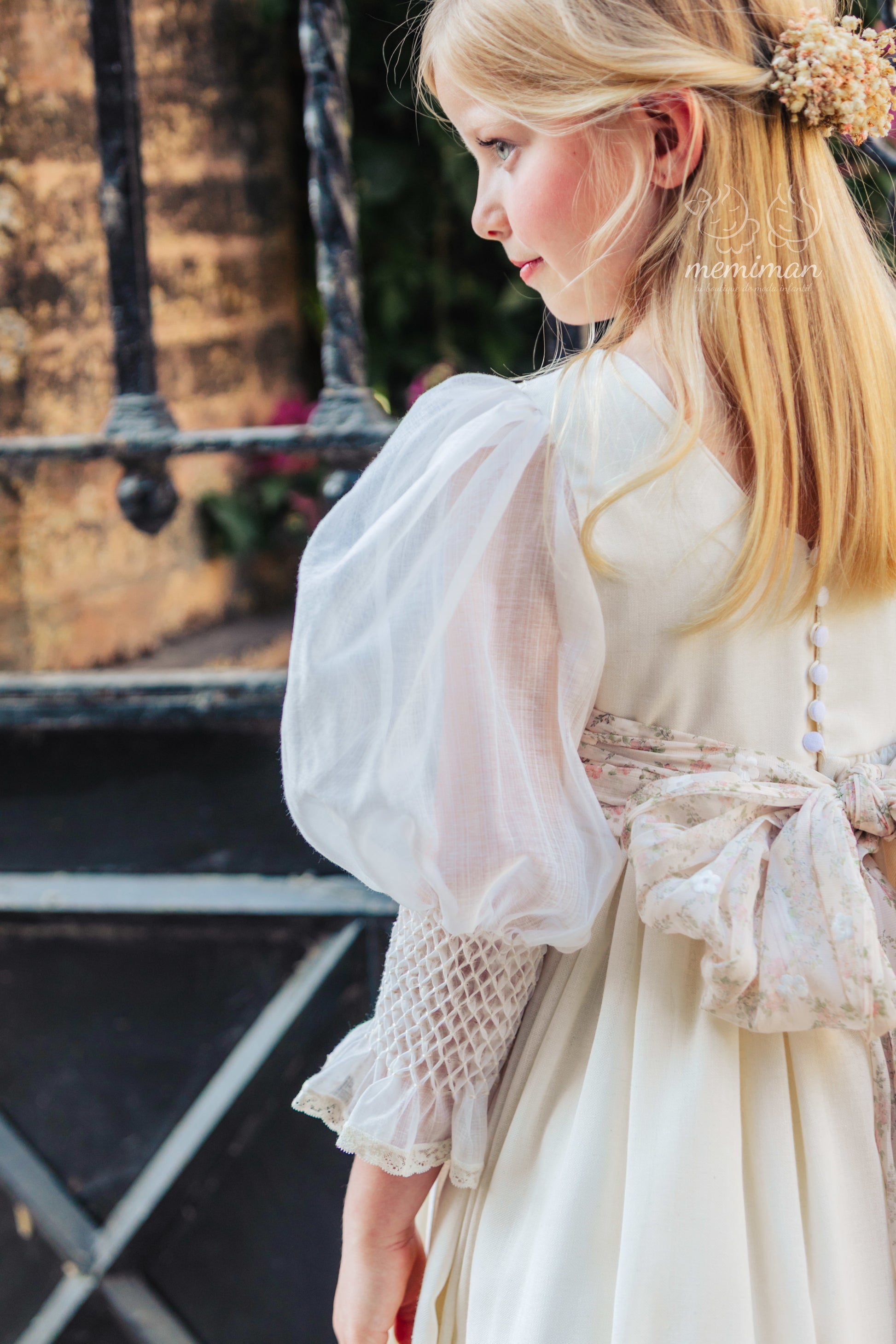 El vestido de comunión MARINA destaca por su diseño con mangas abullonadas que aportan un estilo clásico y elegante. Los puños con bordado de nido de abeja ofrecen un detalle delicado y refinado, mientras que el fajín estampado añade un toque de color y personalidad. Perfecto para que tu niña luzca radiante y cómoda en un día tan especial.