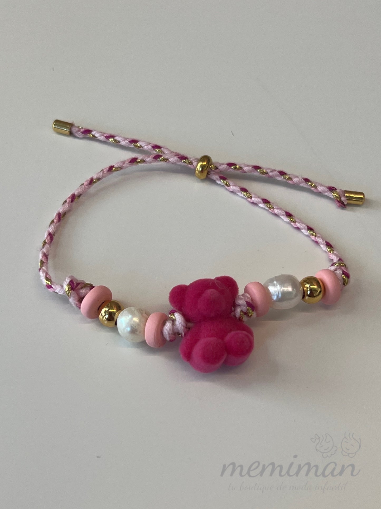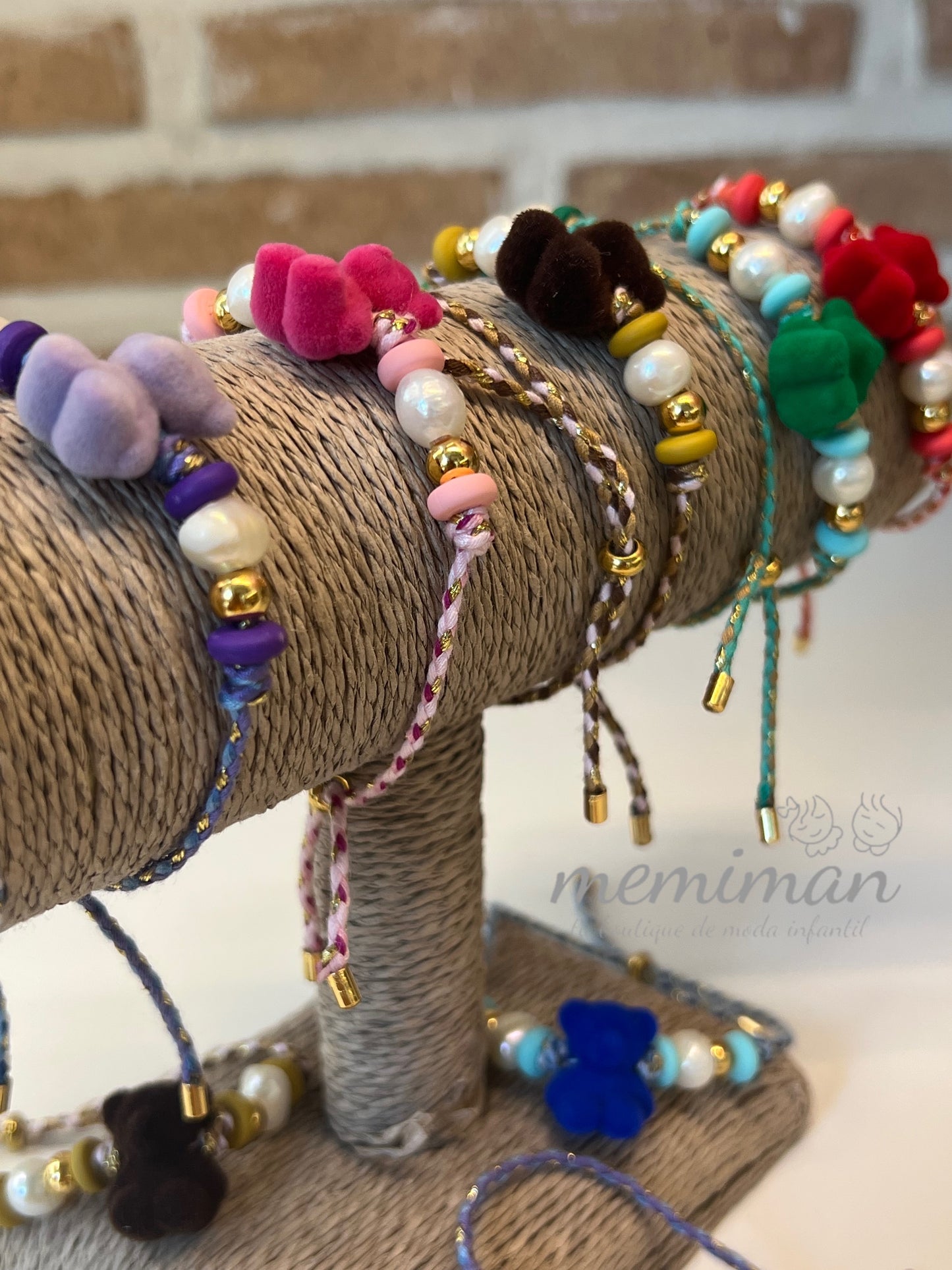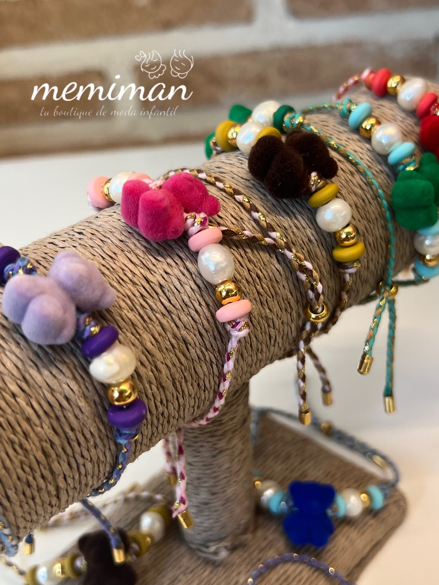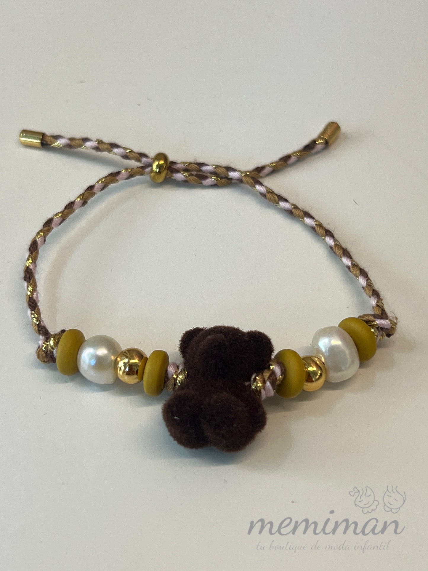 Pulsera de cordón entrelazado, decorada con perlas, bolas de acero dorado y oso de terciopelo. De la colección de by Lu for You.