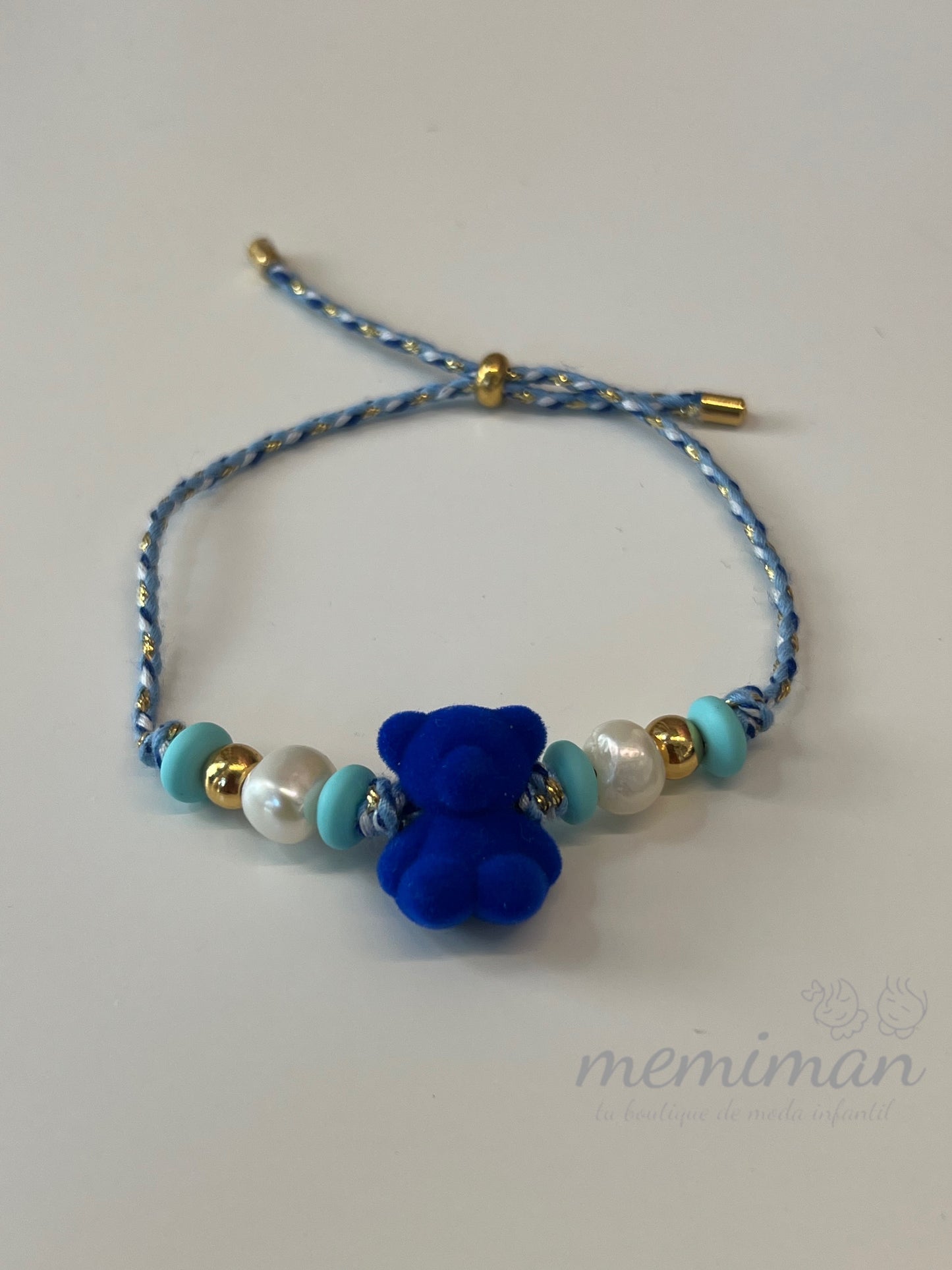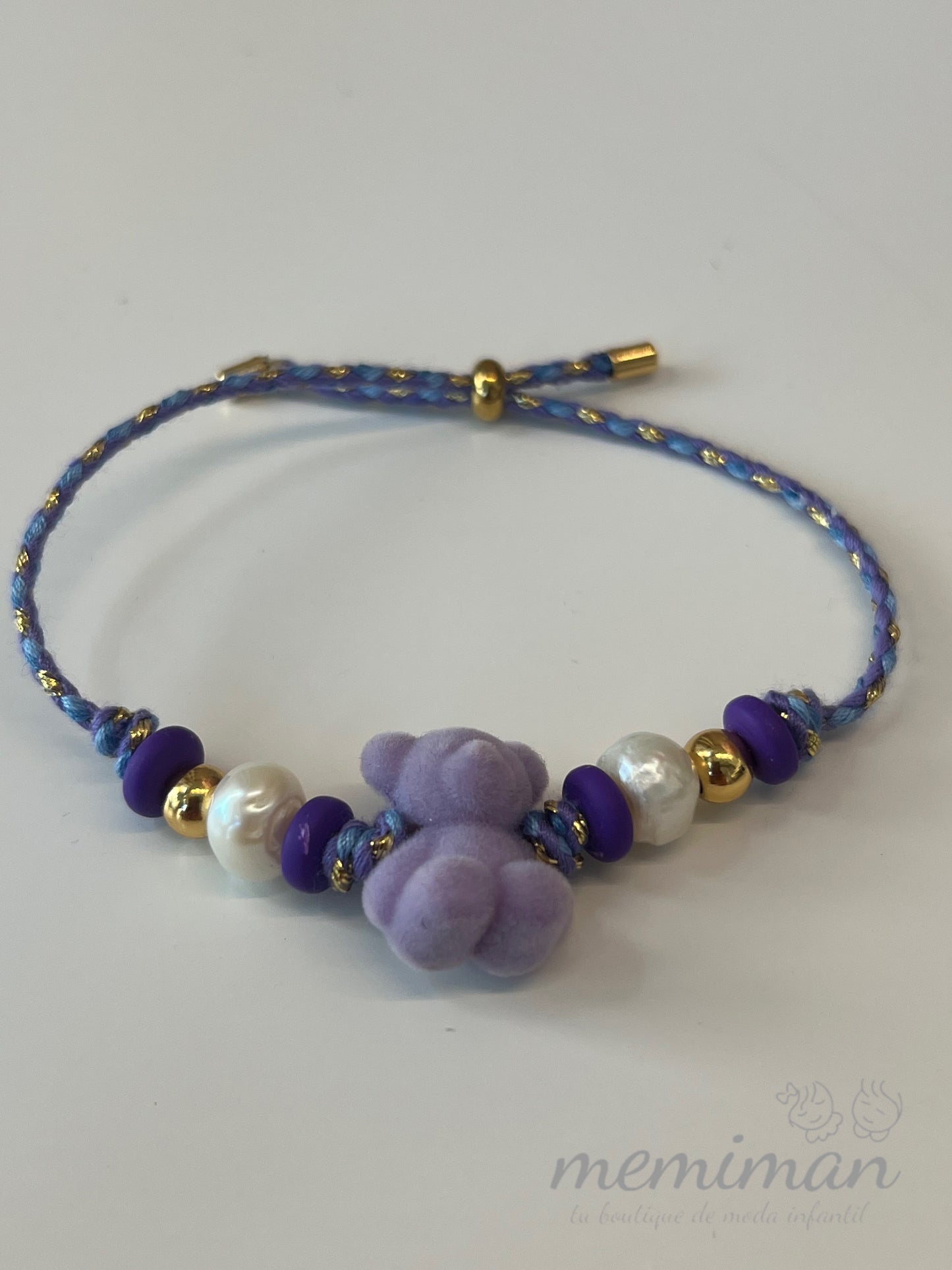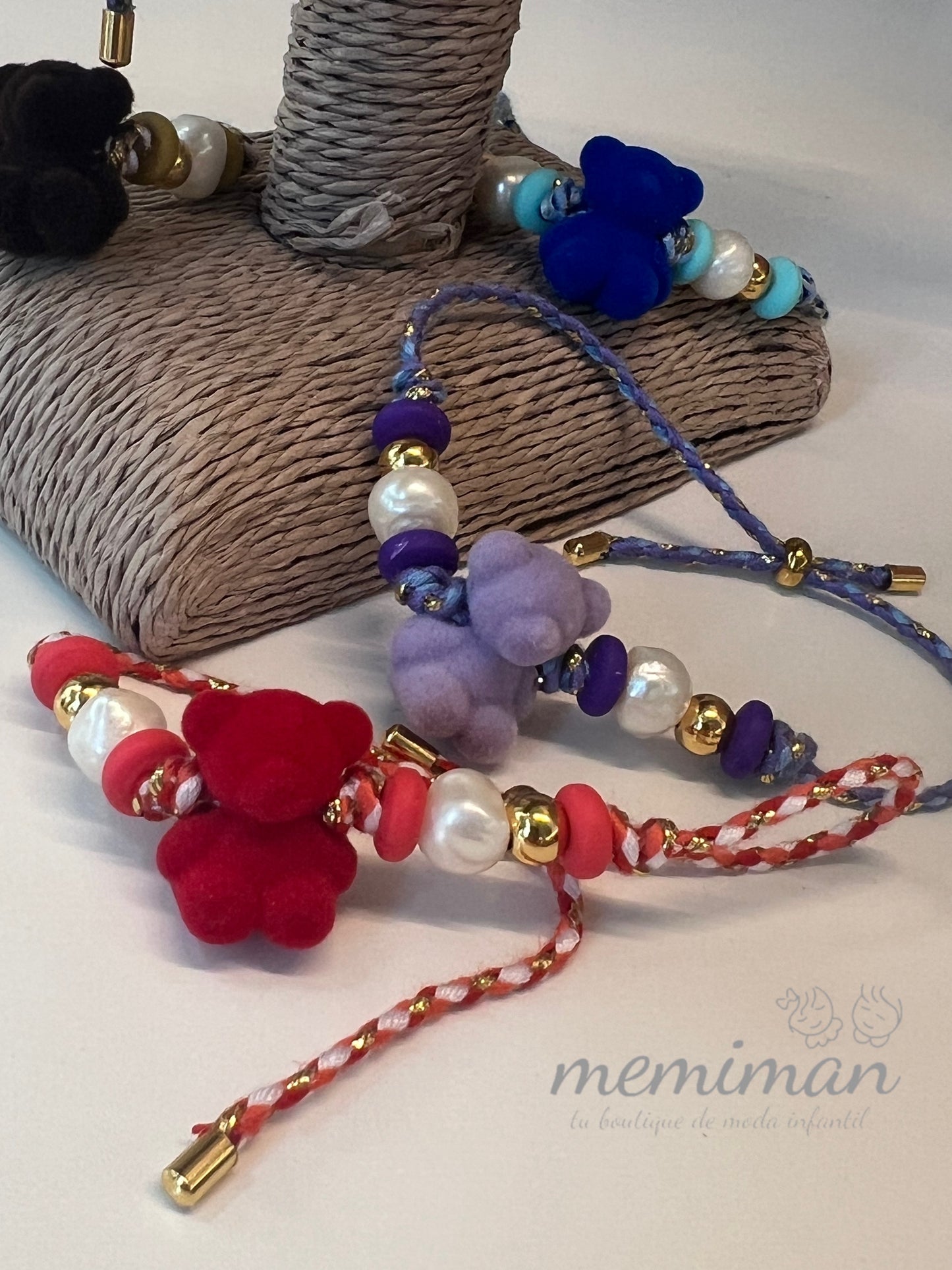 Pulsera de cordón entrelazado, decorada con perlas, bolas de acero dorado y oso de terciopelo. De la colección de by Lu for You.