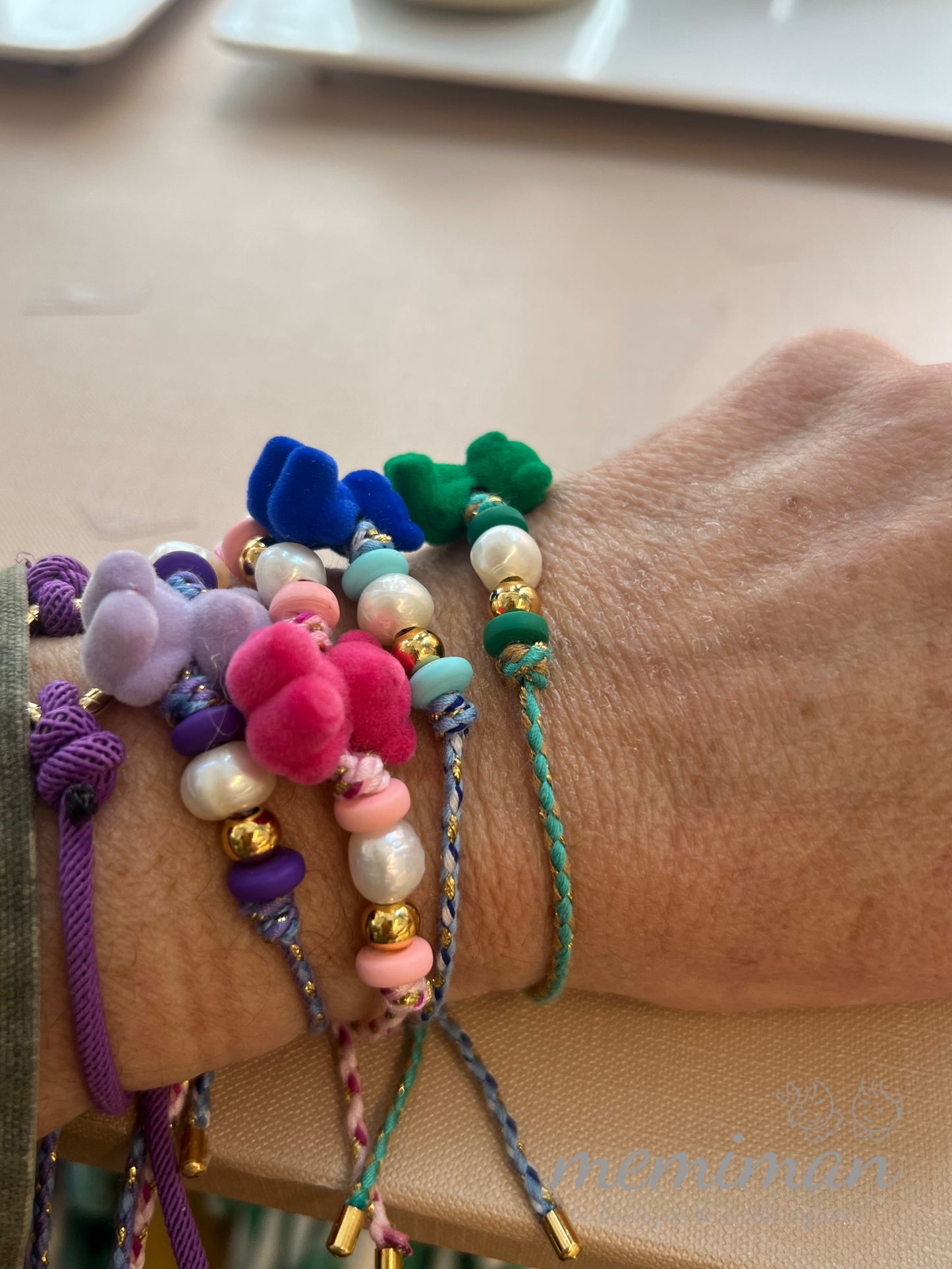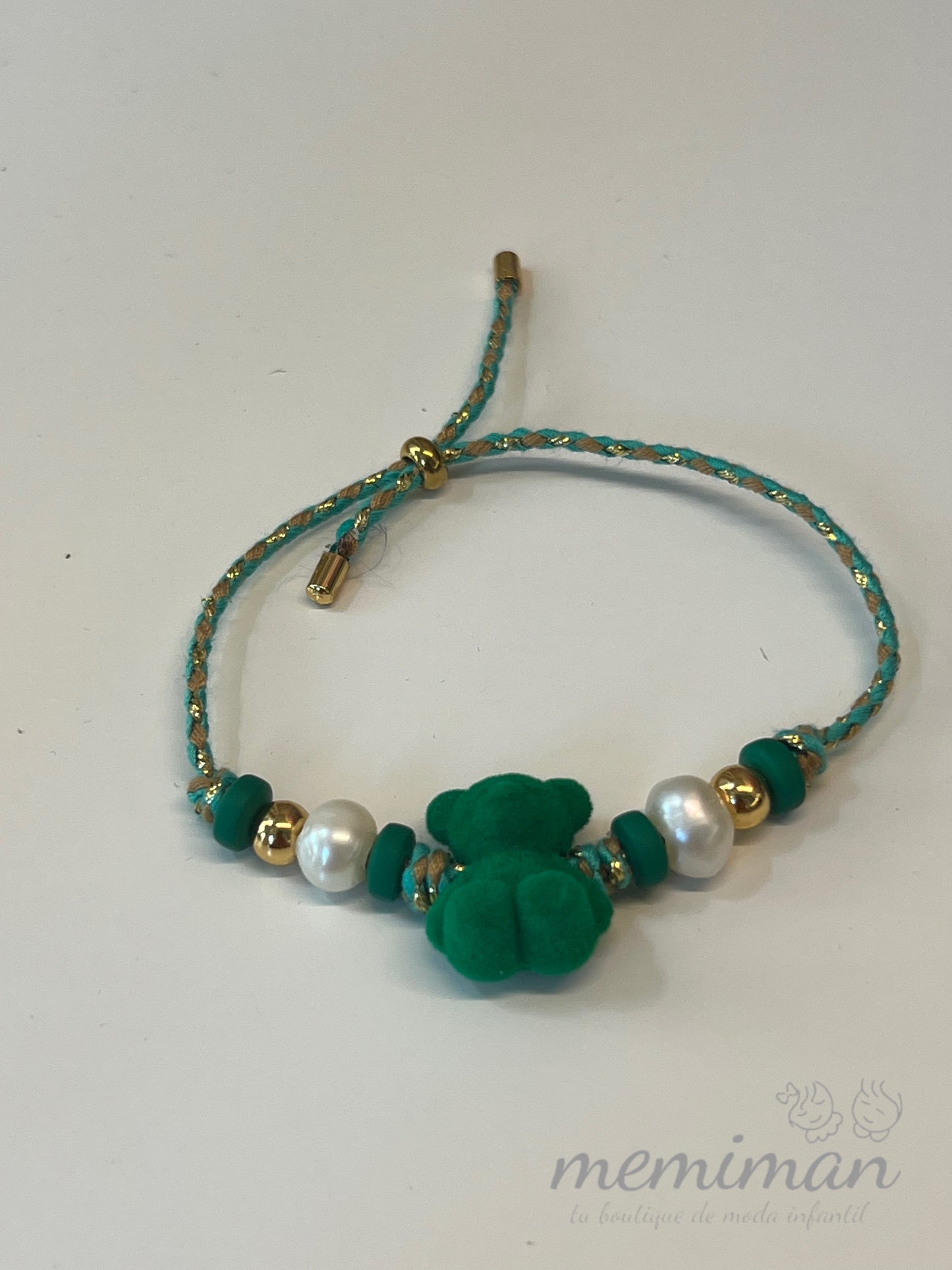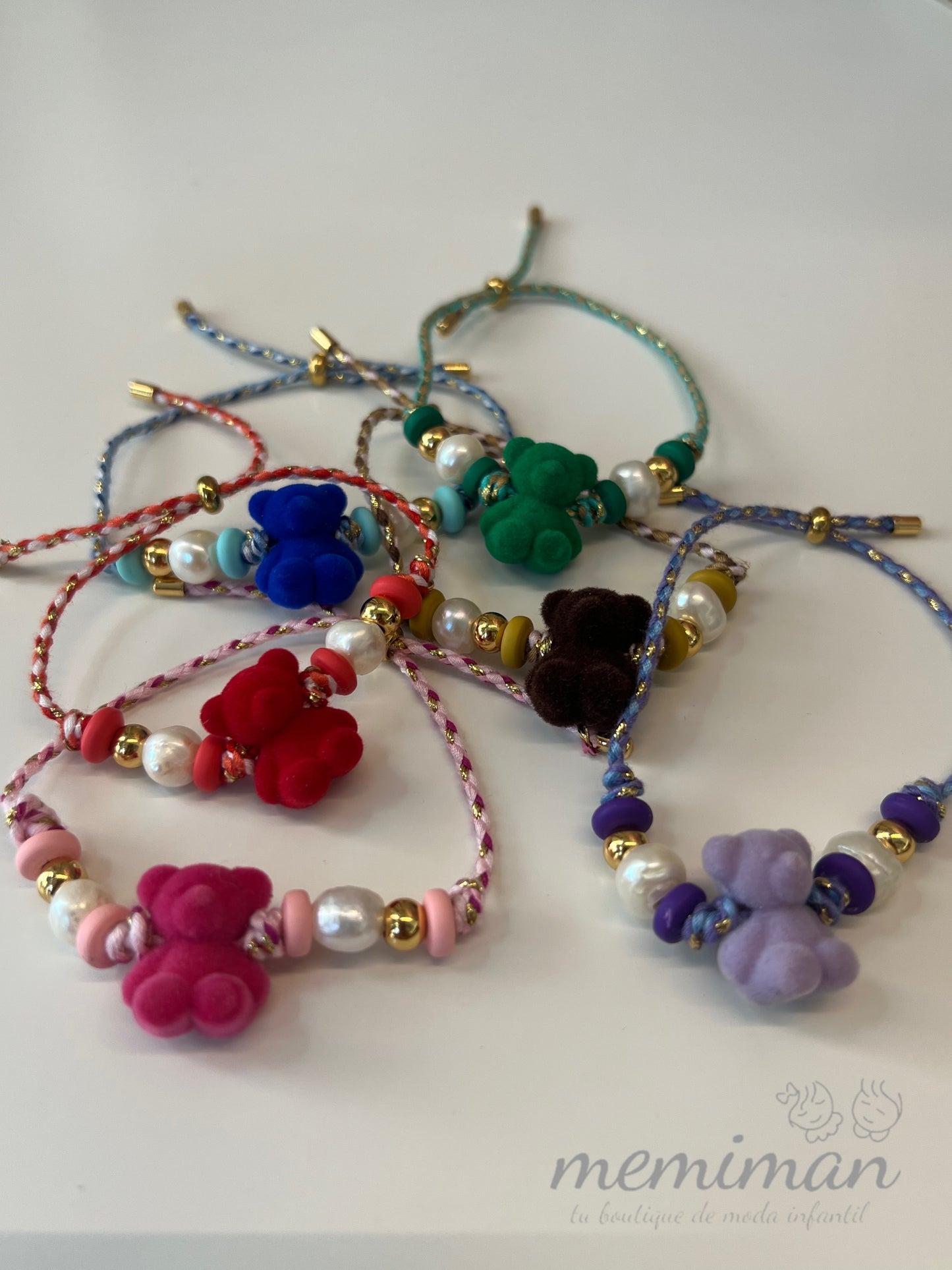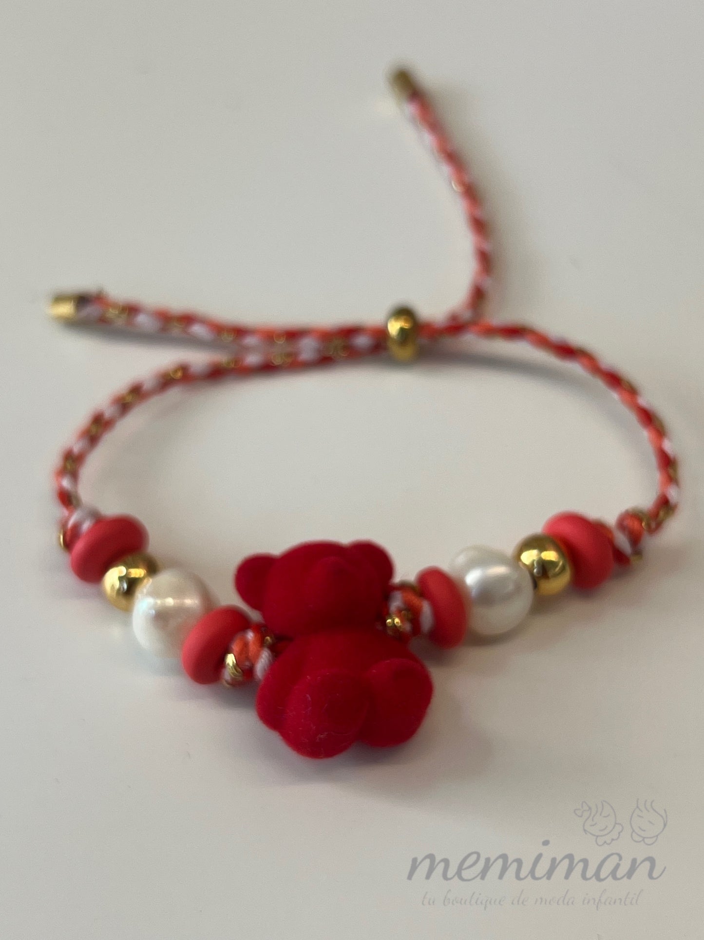 Pulsera de cordón entrelazado, decorada con perlas, bolas de acero dorado y oso de terciopelo. De la colección de by Lu for You.
