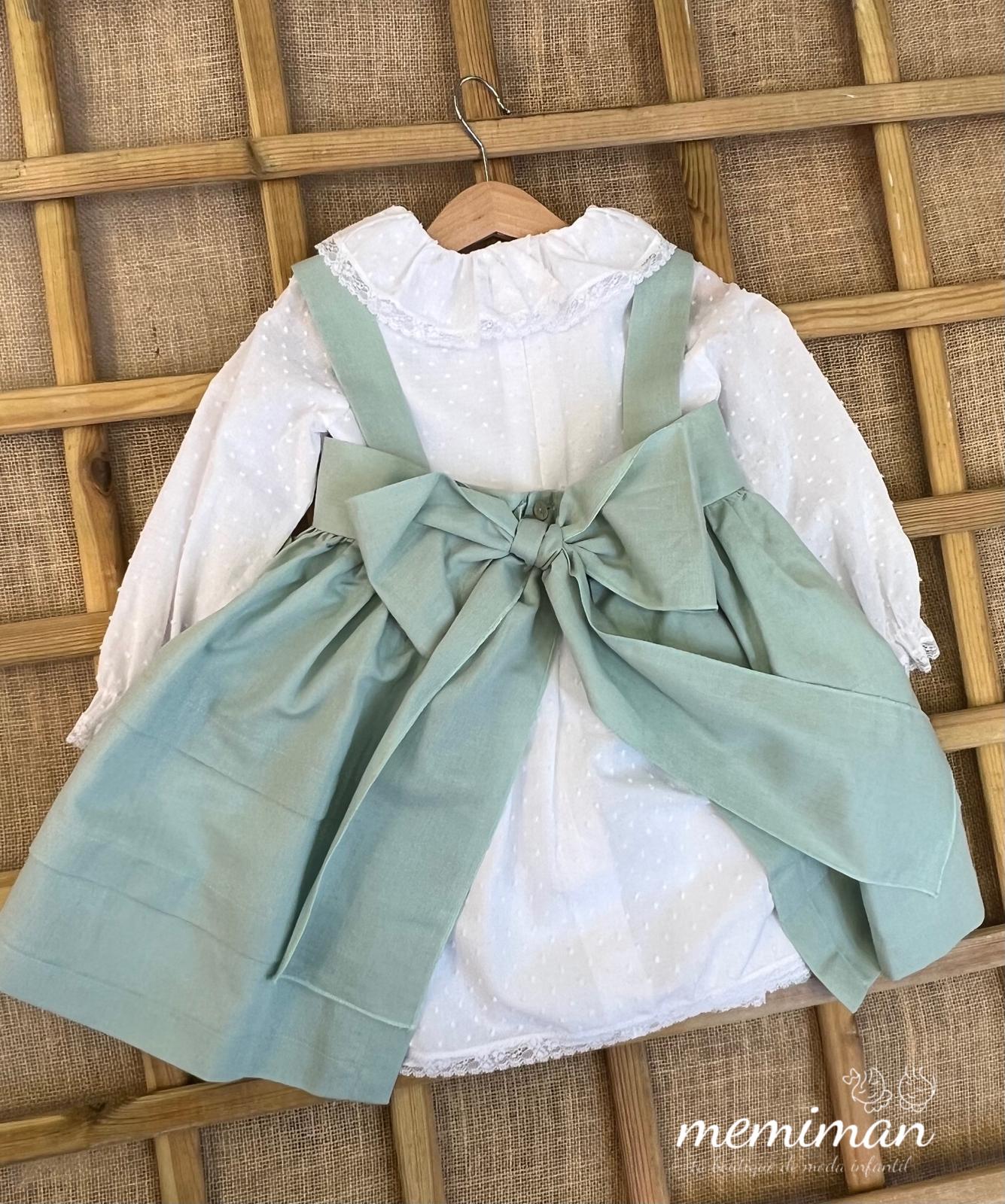 Este conjunto de dos piezas combina un vestido de plumeti con cuello volante y mangas largas, ideal para aportar delicadeza y elegancia, junto a un pichi de lino con jaretas y lazada trasera que ofrece un ajuste cómodo y un estilo clásico. Perfecto para ocasiones especiales o para un look sofisticado y práctico.
