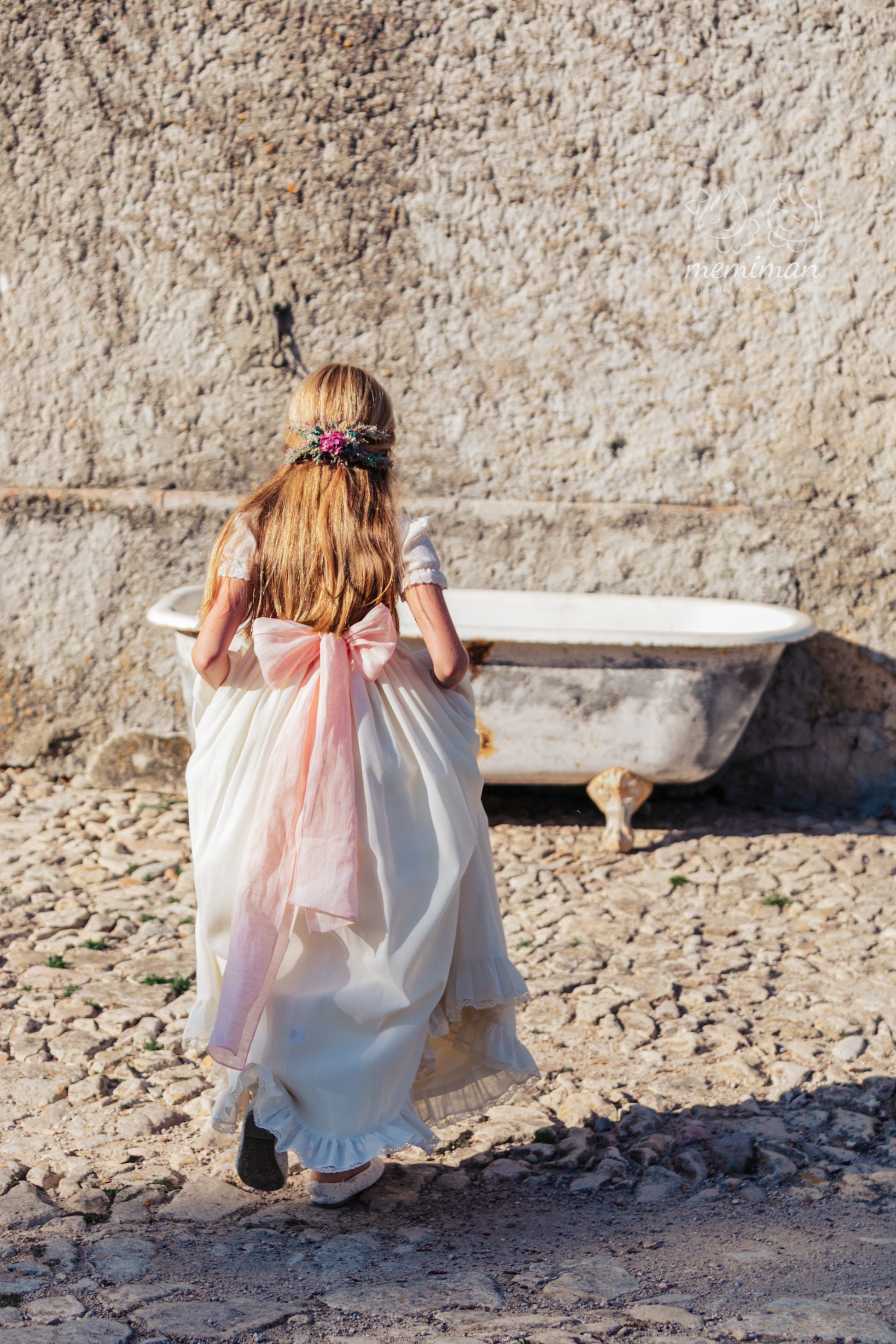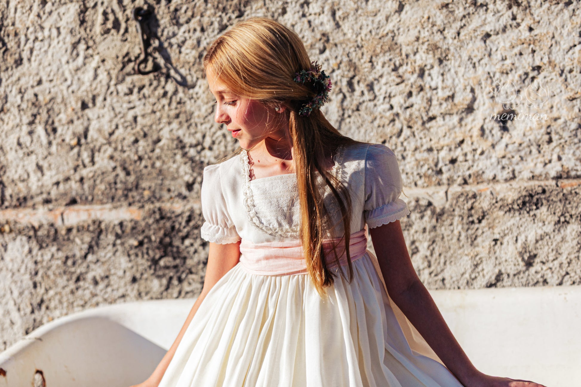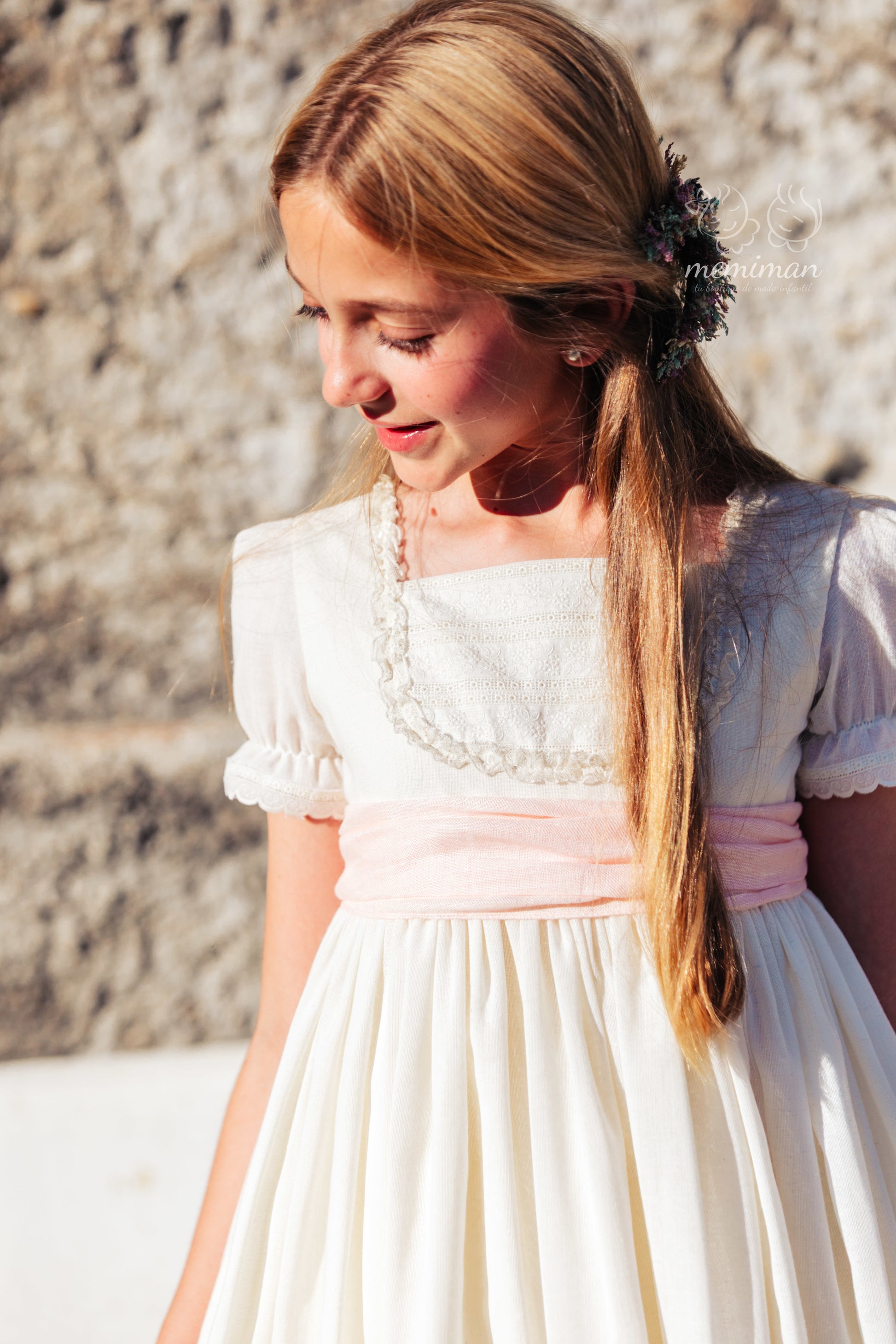El vestido de comunión PATRICIA, con talle alto y escote cuadrado, ofrece un diseño elegante y cómodo para un día especial. Sus mangas cortas proporcionan frescura, mientras que el volante que remata la falda añade un toque delicado y dulce, perfecto para realzar la belleza de la niña en esta ocasión única.