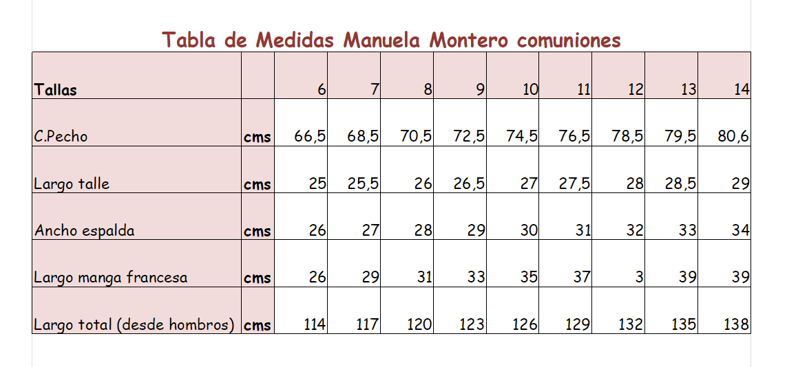 Consulta nuestras condiciones generales de venta, y la guía para tomar medidas de comunión niña que aparece más abajo, en la pestaña de tallas y toma de medidas. NO admite cambio ni devolución.