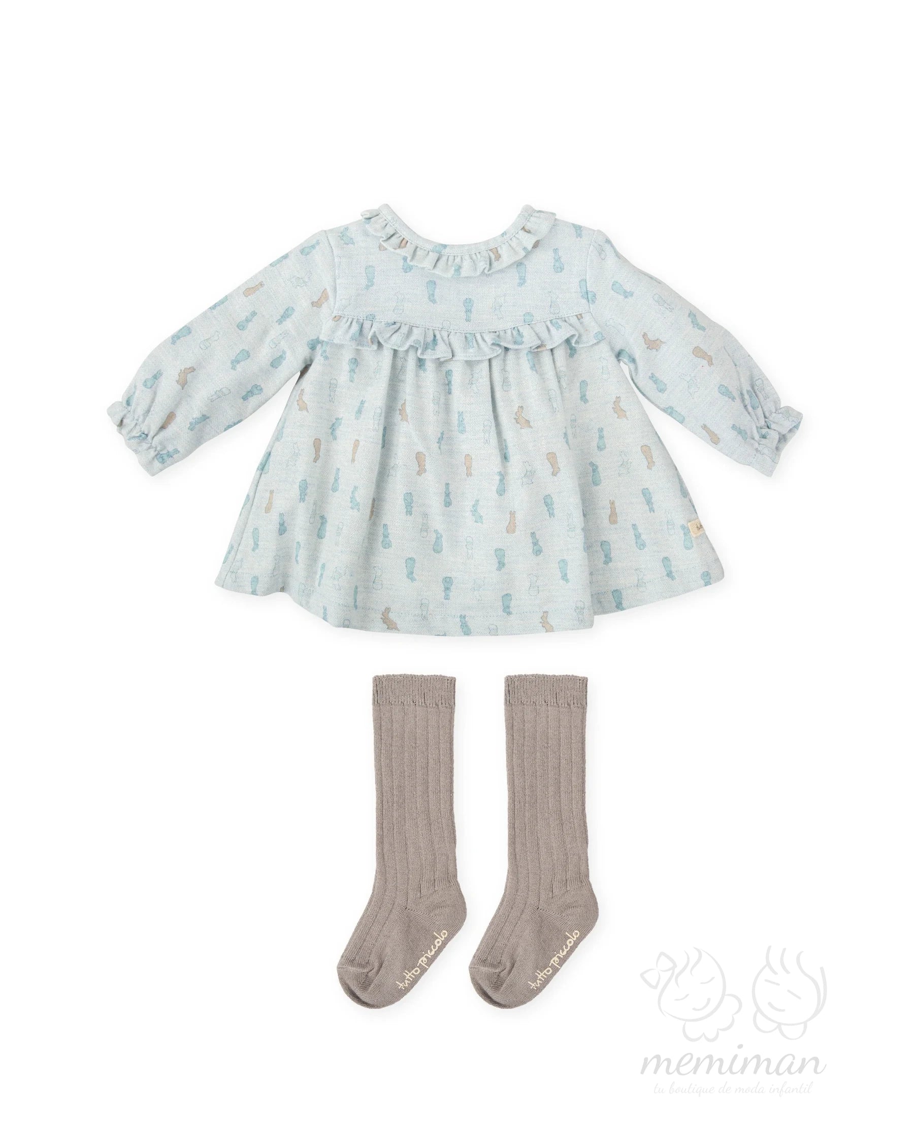 Vestido de tejido estampado conejitos con volante en el cuello y canesú, suave goma que ajusta los puños, abertura trasera con botones, enagua en voile blanco. Combina con calcetines* color arena (*no incluidos).