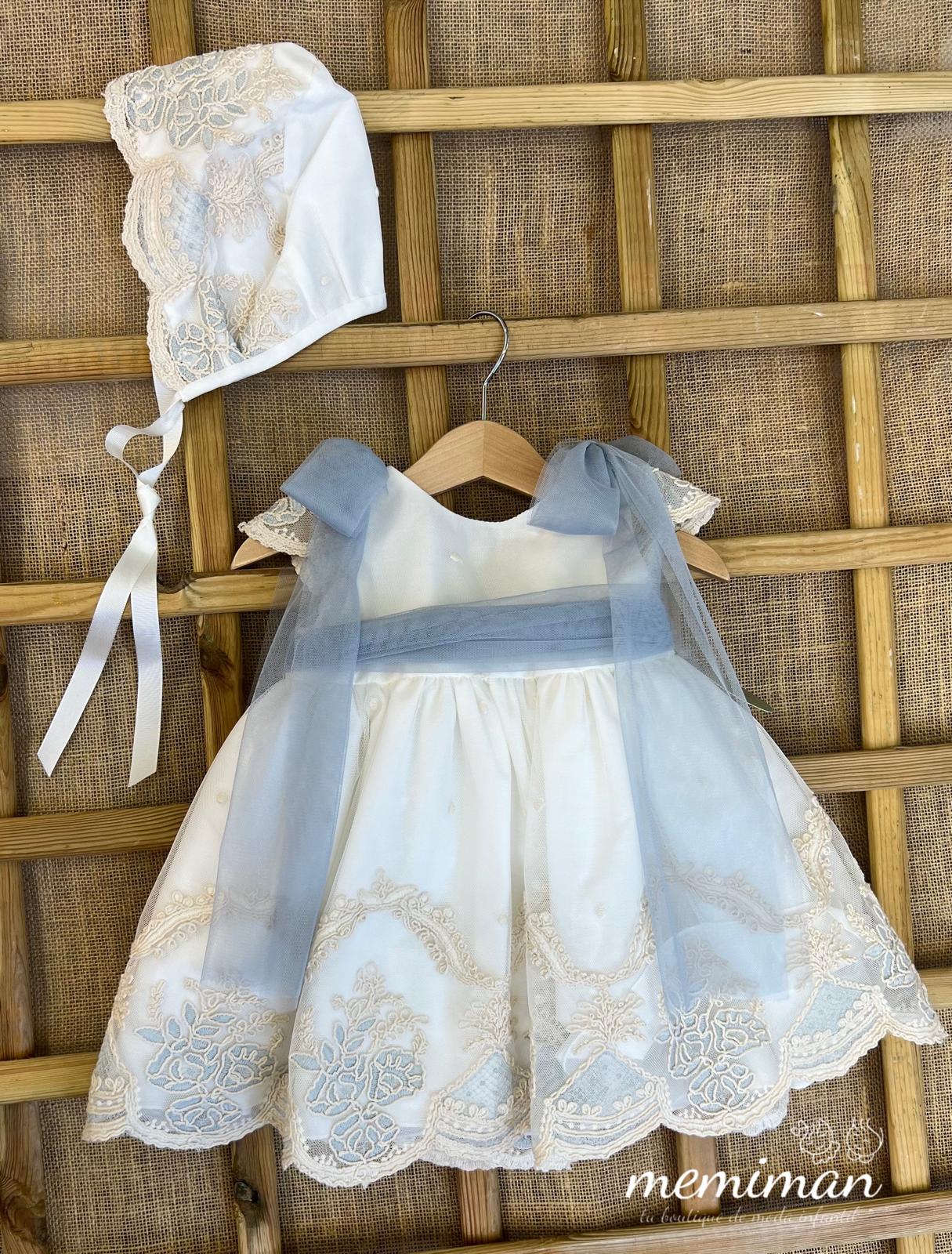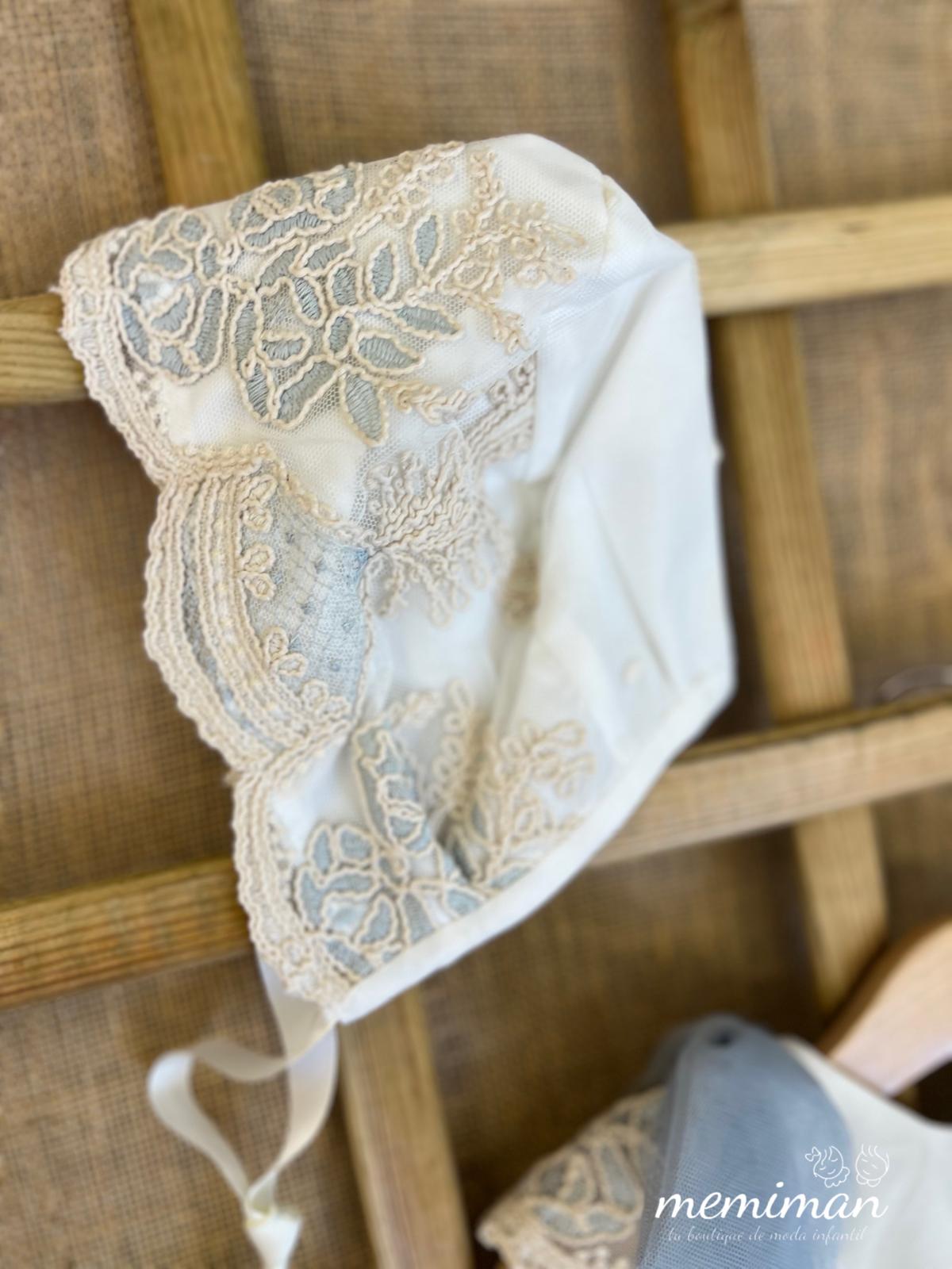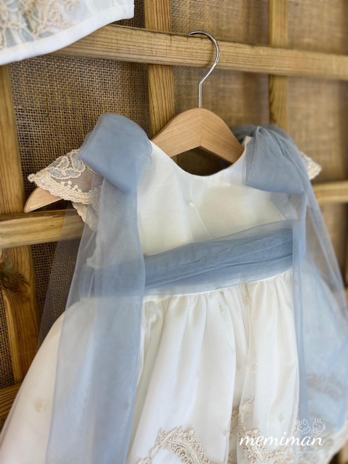 Este jesusito con braga y copata, de ceremonia para niña combina elegancia y delicadeza con un cuerpo de talle alto que aporta un ajuste perfecto y sofisticado. Sus mangas cortas ofrecen un toque clásico, mientras que las dos grandes lazadas de tul azul en los hombros añaden un detalle distintivo y encantador. El tul bordado aporta textura y profundidad, haciendo de este vestido una opción ideal para ocasiones especiales donde se busca un estilo refinado y único.